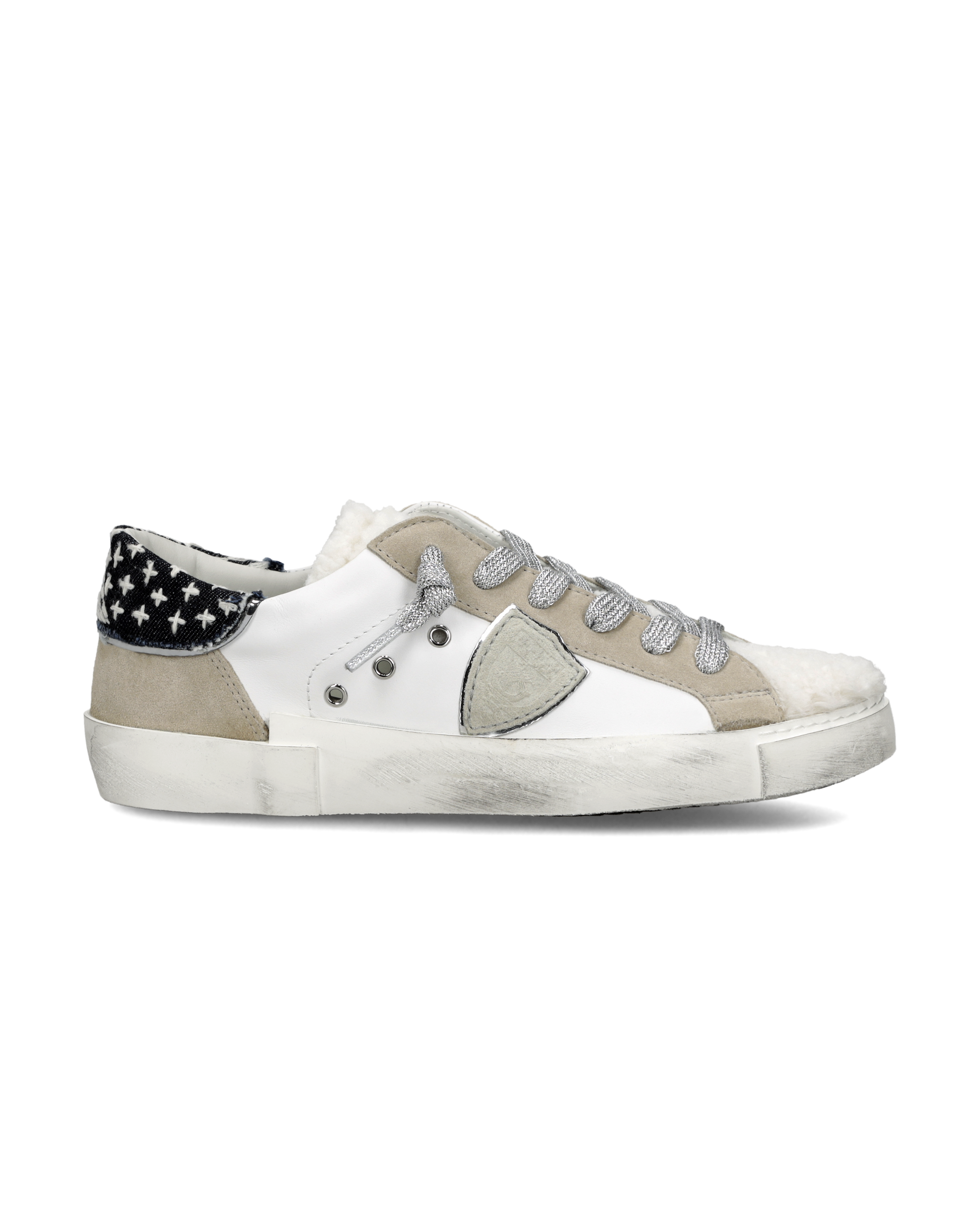 Eine Mischung aus Materialien und ein Spiel der Kontraste, die eine Ikone wie den Prsx einzigartig machen. Das Obermaterial ist aus Leder und Wildleder mit besonderer Sashiko-Stickerei auf dem Spoiler aus Denim: eine traditionelle japanische Sticktechnik, die zur Verzierung und auch zur funktionellen Verstärkung von Stoffen und Kleidung verwendet wird. Zunge aus Kunstfell für die kalten Monate. Das Design bleibt unverändert ikonisch, mit geprägtem Wappen an der Seite und handgefertigter Einfassung der Sohle mit Flecken.