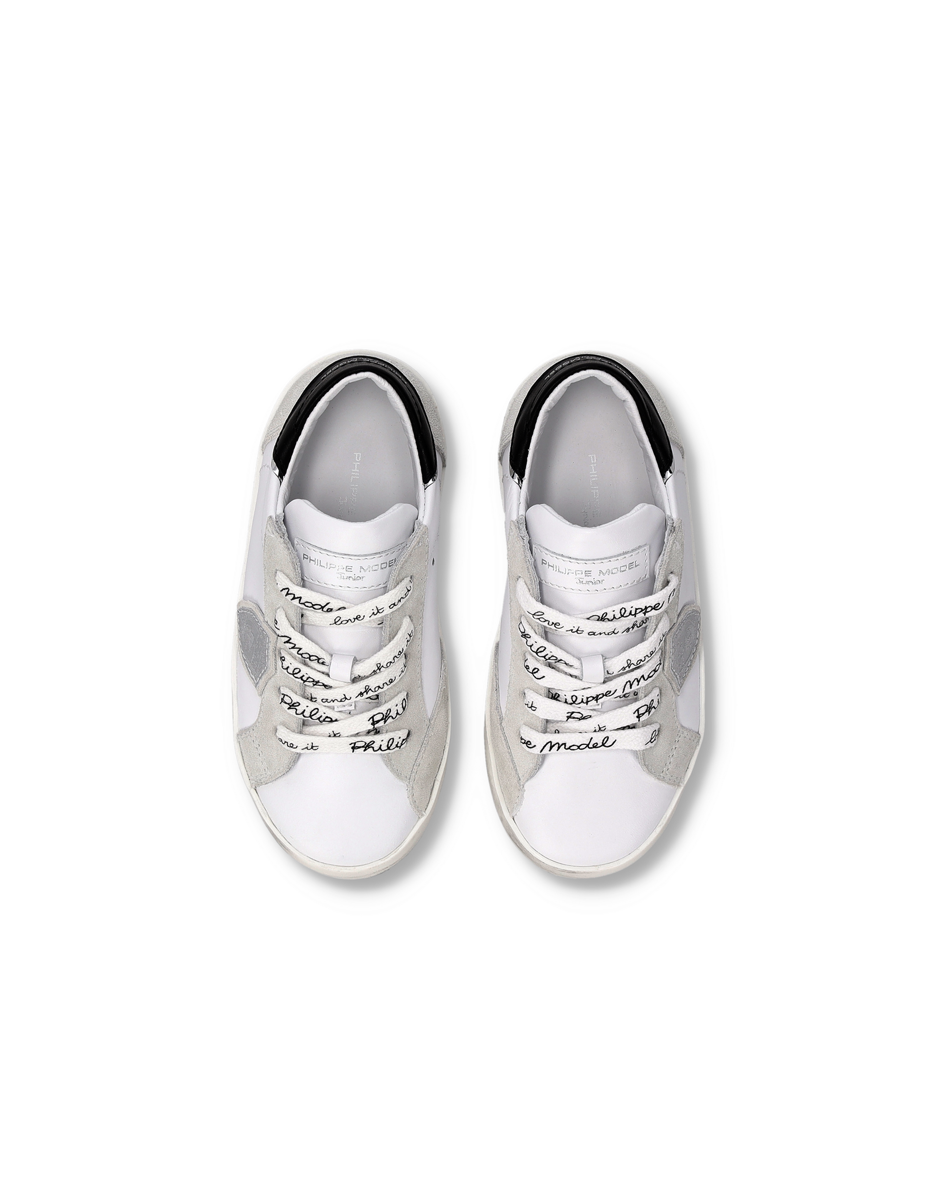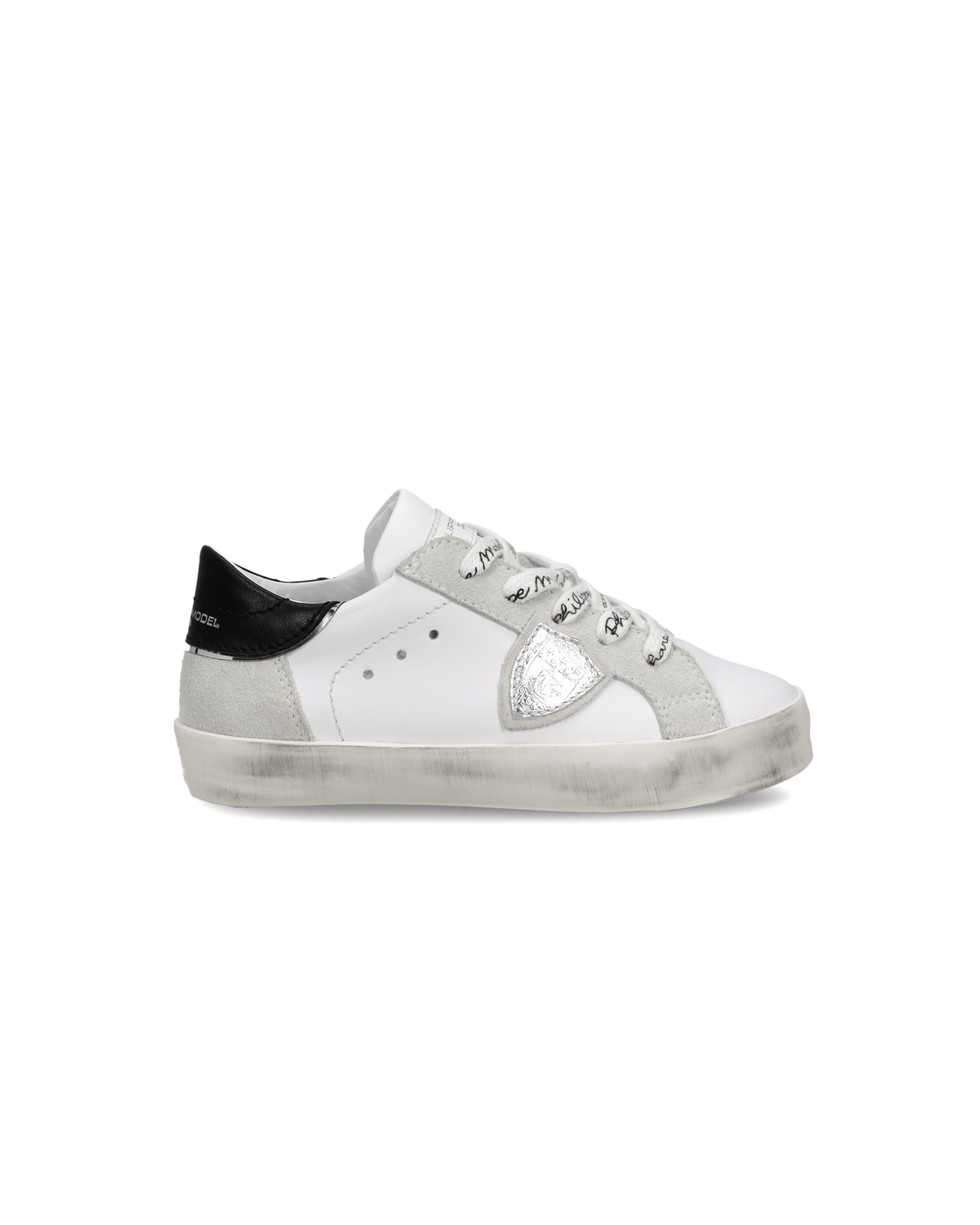 The iconic Prsx sneaker is now available in a baby version. Have you ever seen anything more adorable? The sole is the iconic brushed rubber, creating a vintage effect. This model is crafted from black leather, with contrasting silver details and black suede on the eyelets and heel. Unique and fun even for the little ones, featuring the logo on the laces.