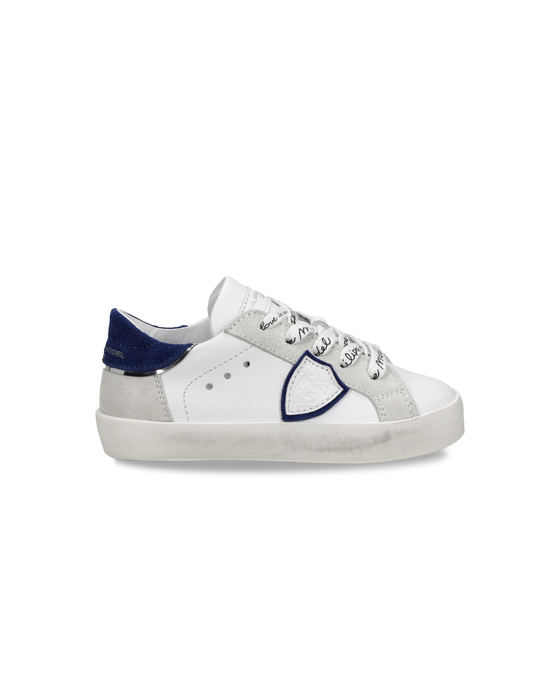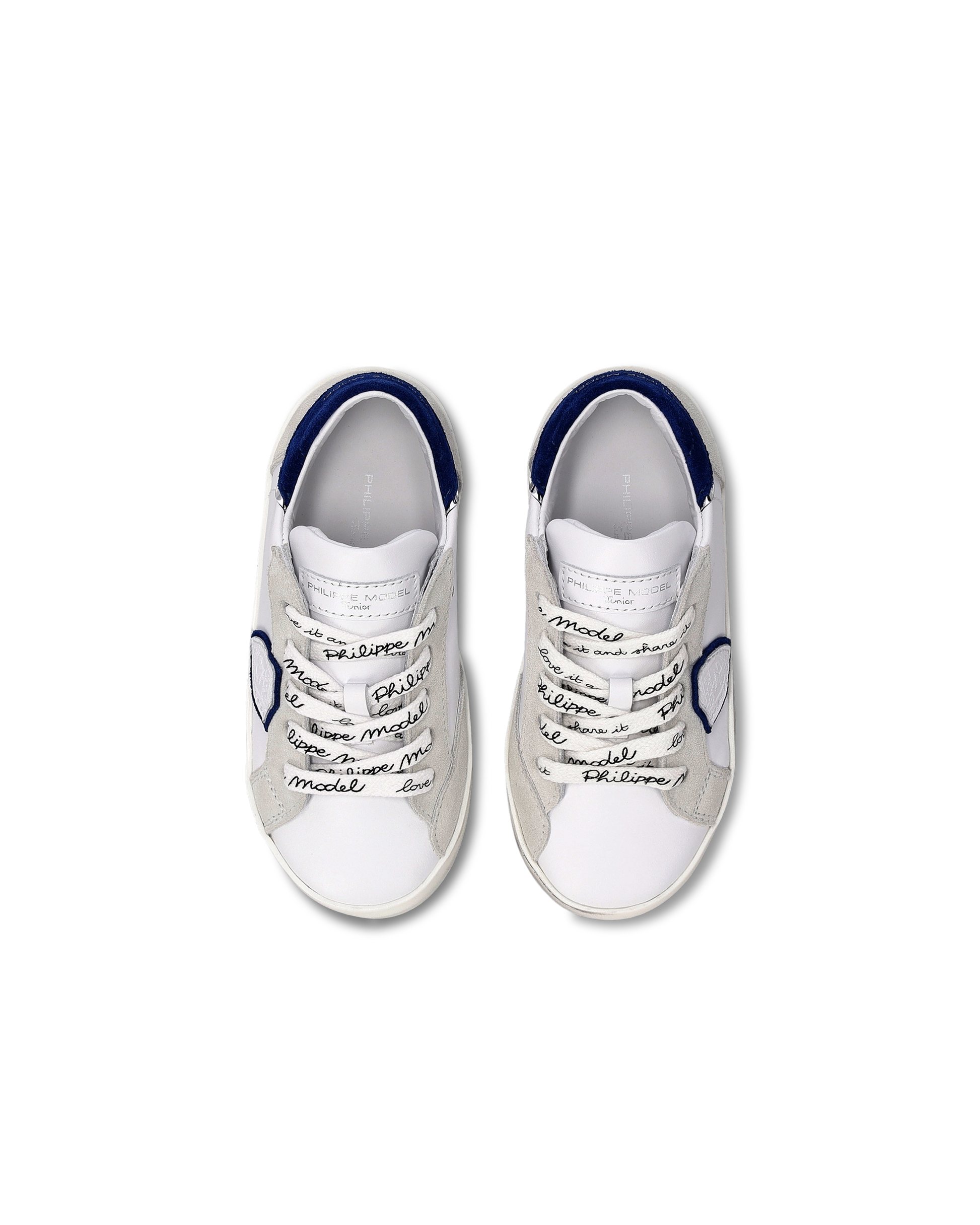 The iconic Prsx sneaker is now available in a baby version. Have you ever seen anything more adorable? The sole is the iconic brushed rubber, creating a vintage effect. This model is crafted from white leather, with contrasting bluette details and grey suede on the eyelets and heel. Unique and fun even for the little ones, featuring the logo on the laces.