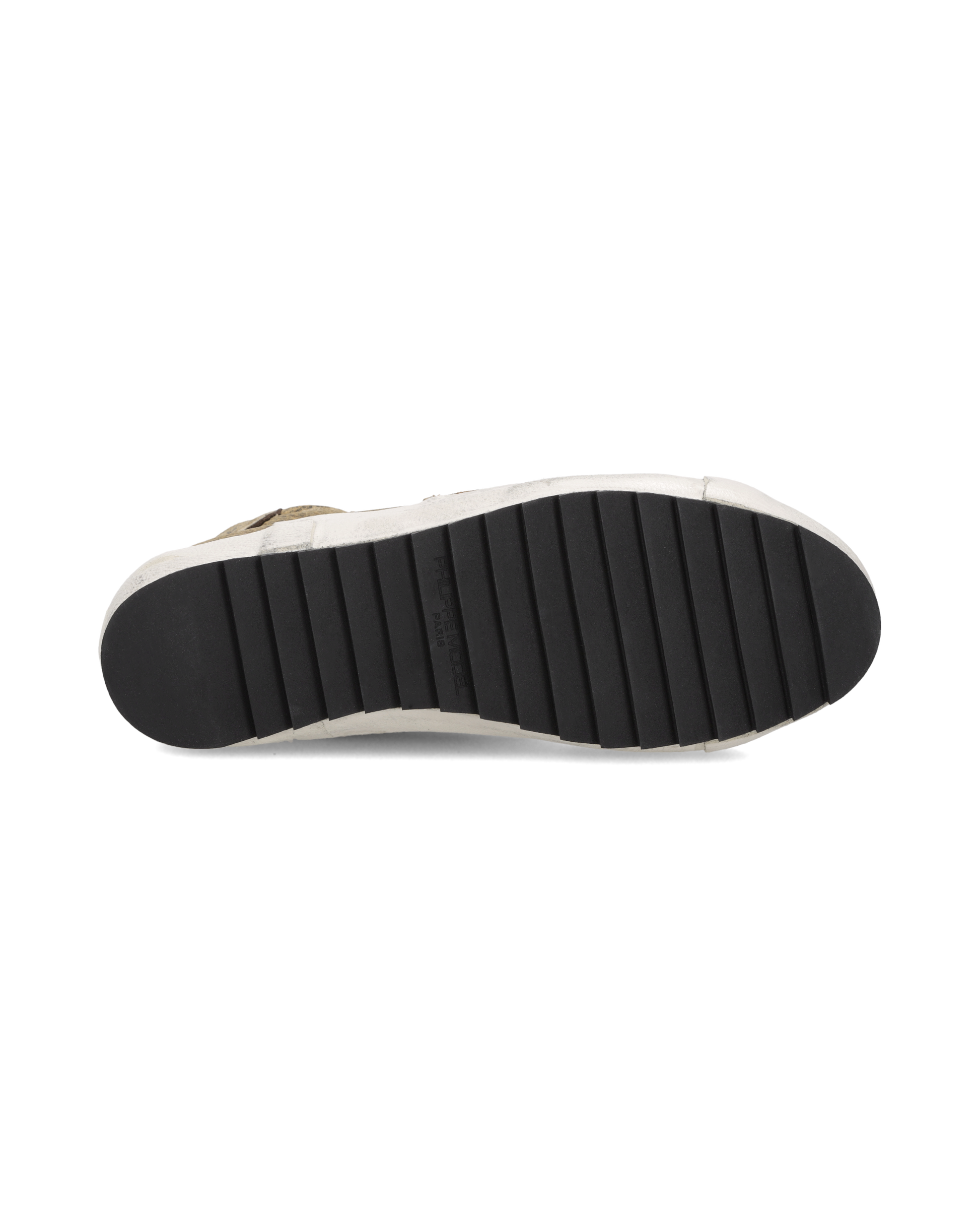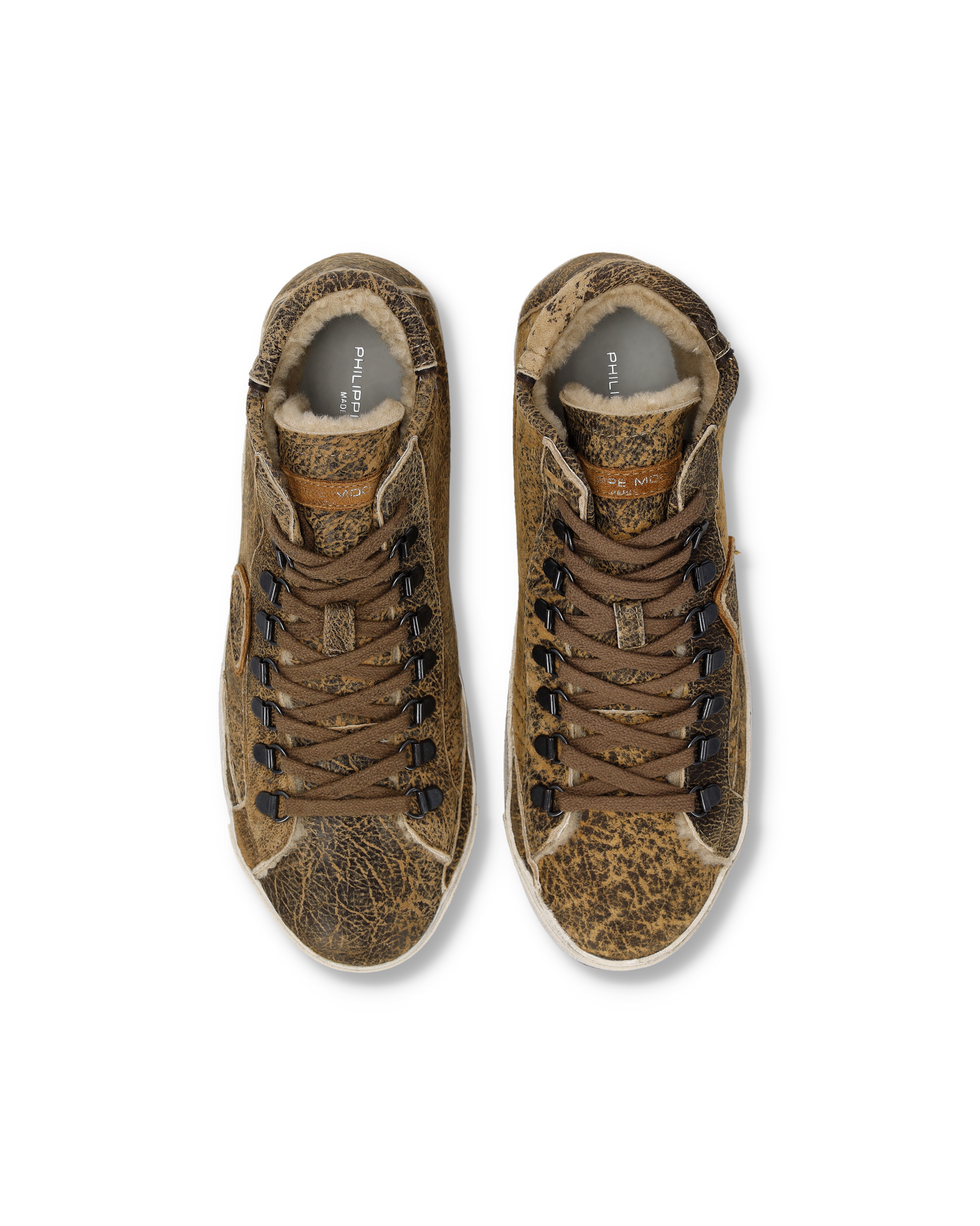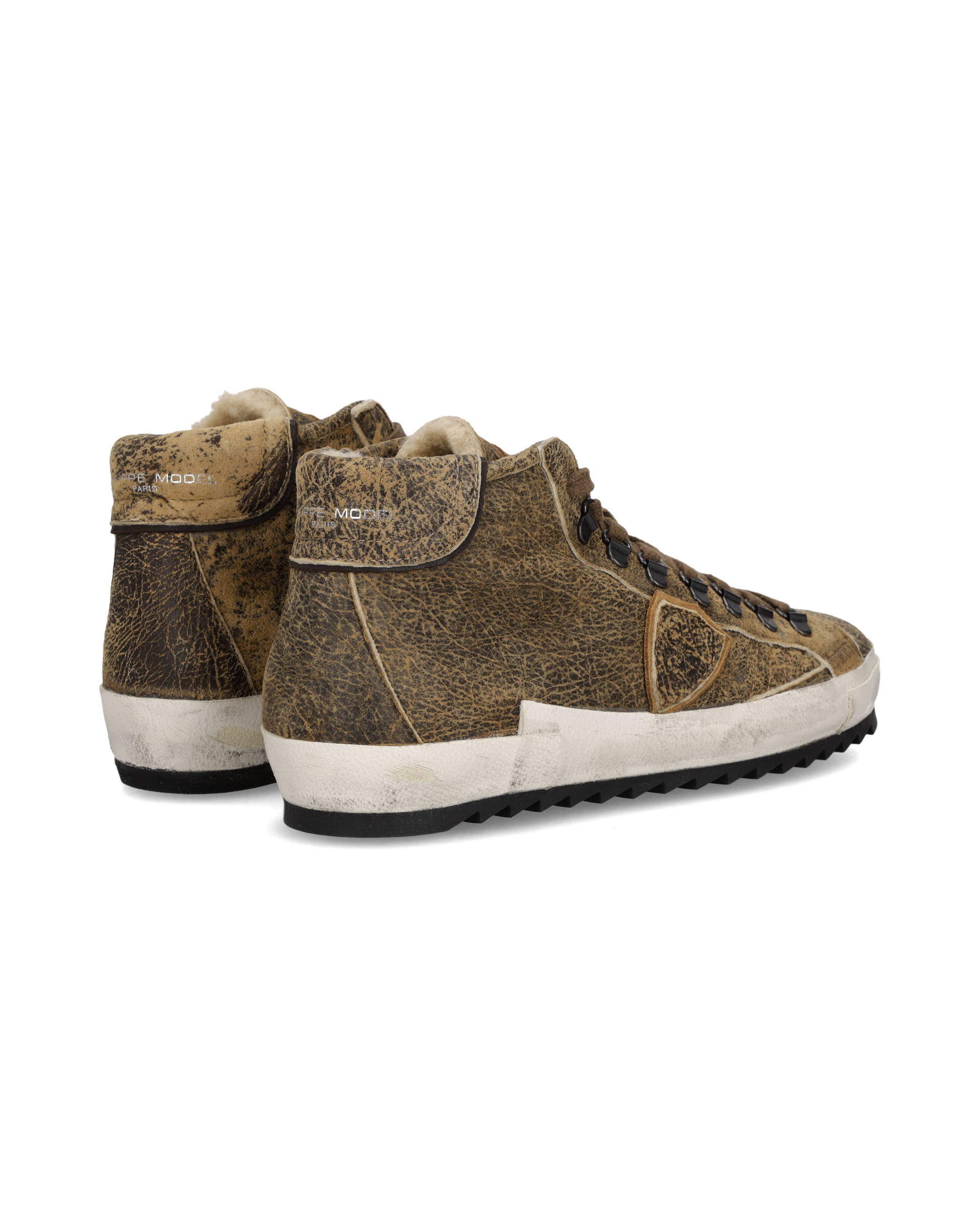 The Prsx icon embraces mountain style. This high-top leather sneaker is made of brown sheepskin with a faux fur lining. It features details that recall vintage boots, such as the effect on the leather and the hooks as eyelets. The side band of the sole is handcrafted with markings for a worn effect, and the sole is lugged.