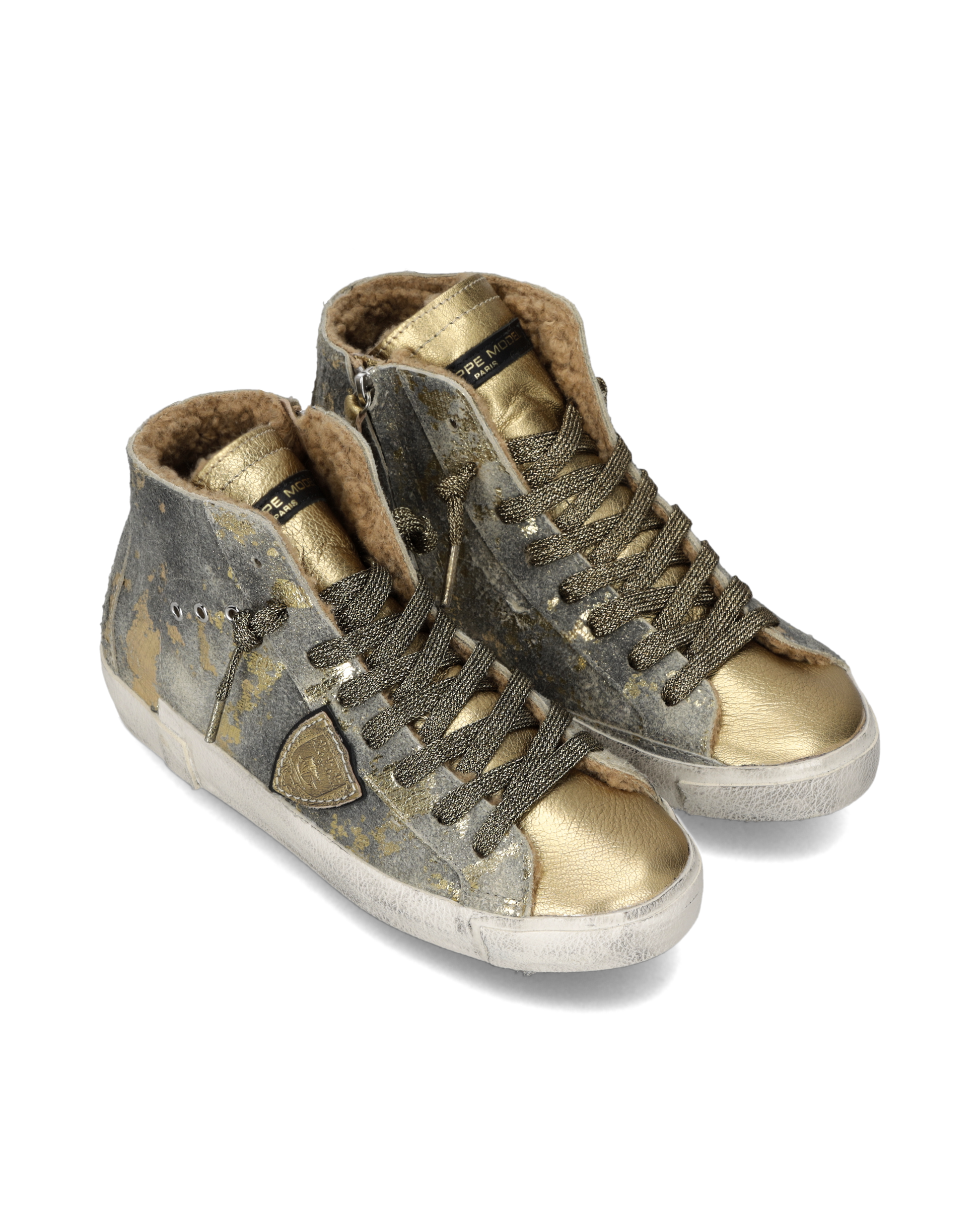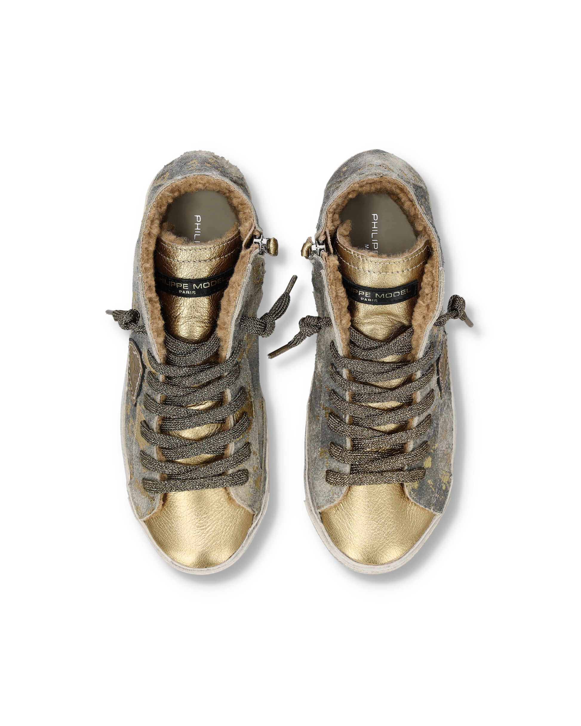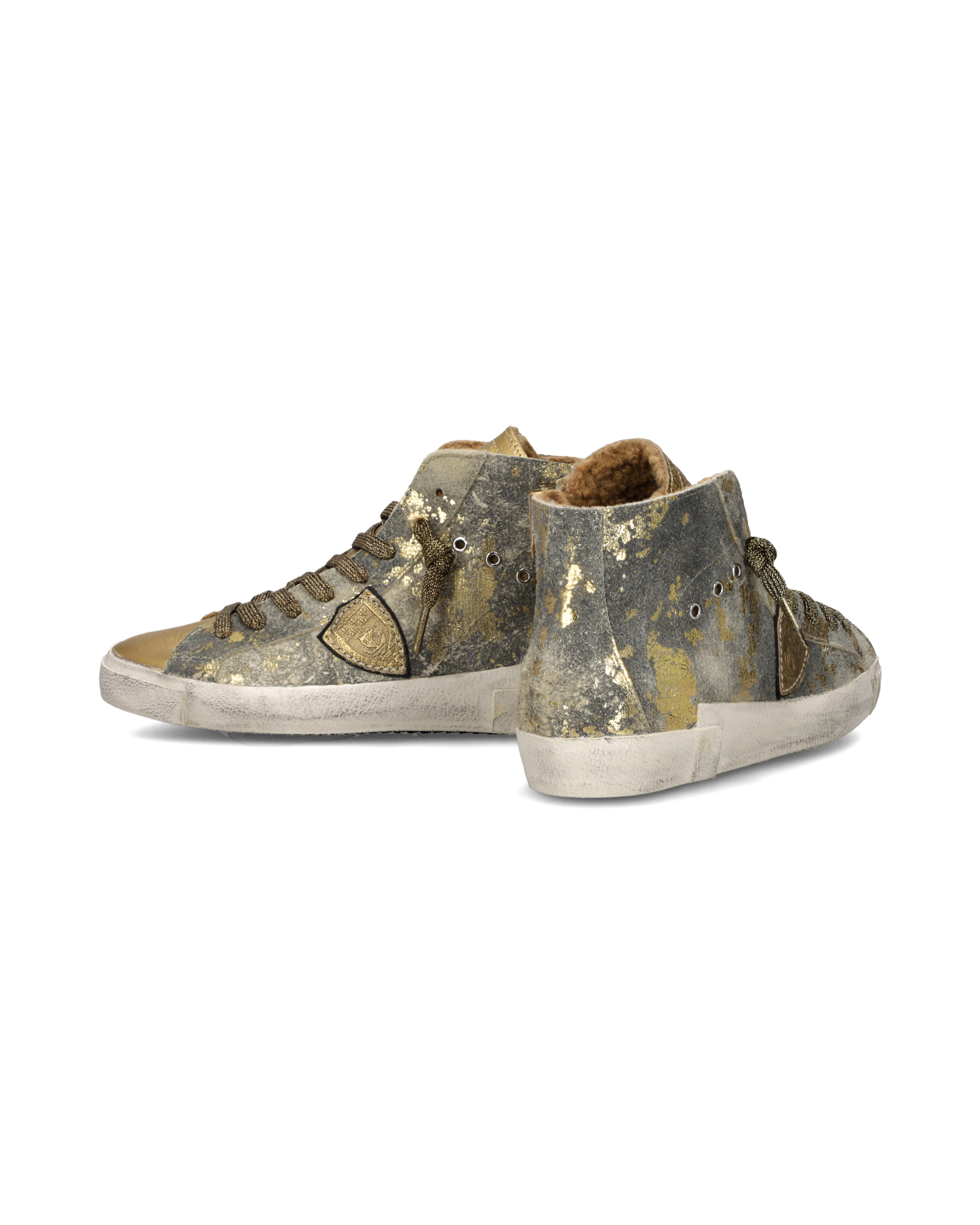 A play of contrasts that make an icon like Prsx high truly unique. The lightweight upper in autumn colors combines anthracite and gold marbled leather with laminated accents. The construction of this hig-top women's sneaker remains the iconic one, with an embossed shield on the side and a handcrafted sole band with markings.