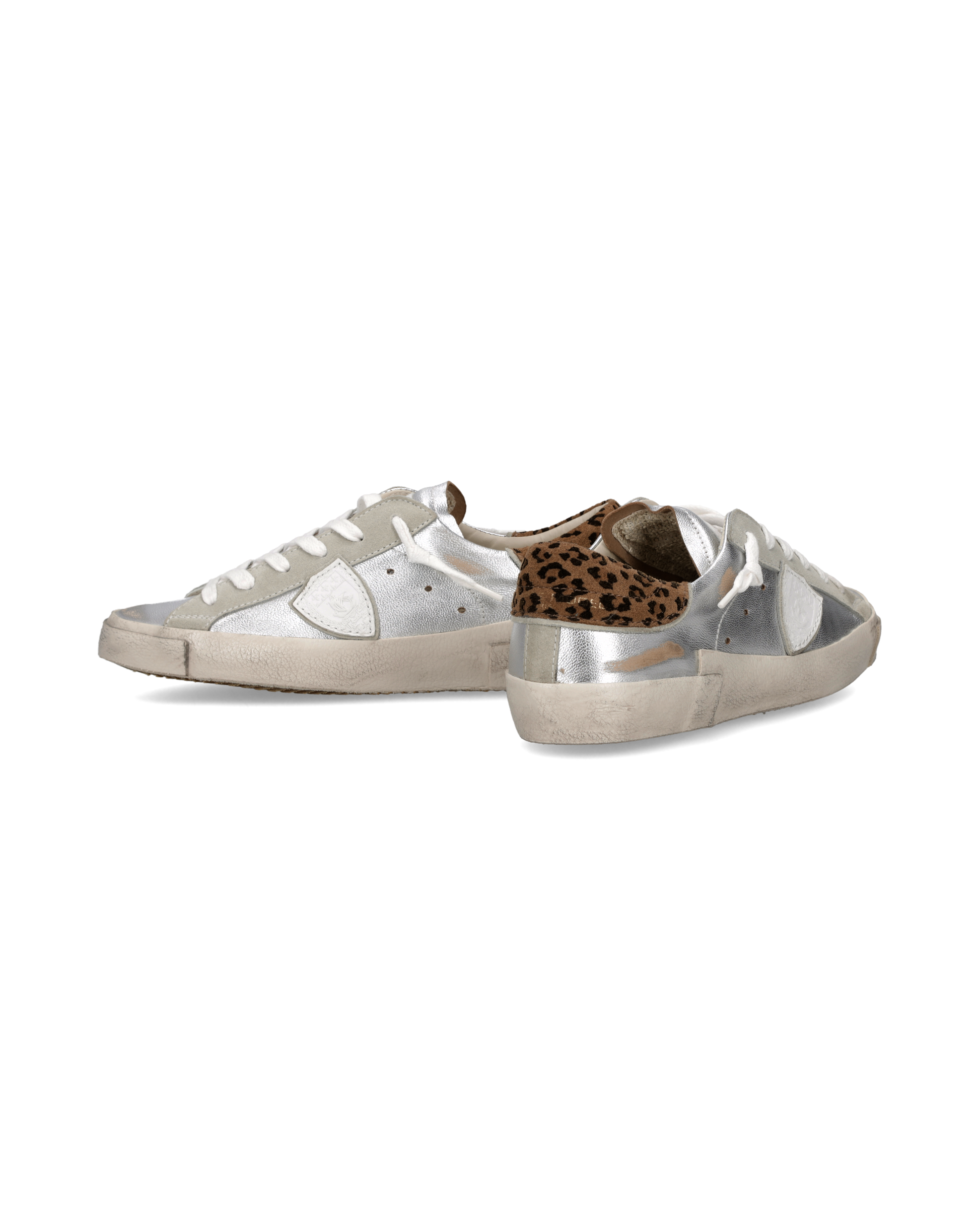 Prsx embraces the animal-print trend with a bold attitude while remaining true to its unmistakable style. The silver laminated leather upper, with a vintage finish, gives a bold, worn look. Contrasting details define the design of this low-top women's shoe. The eyelets are in beige suede, and the heel tab is leopard-print, adding a wild yet refined touch. The iconic sole with handcrafted milling and distressed markings emphasises the worn effect of the design.