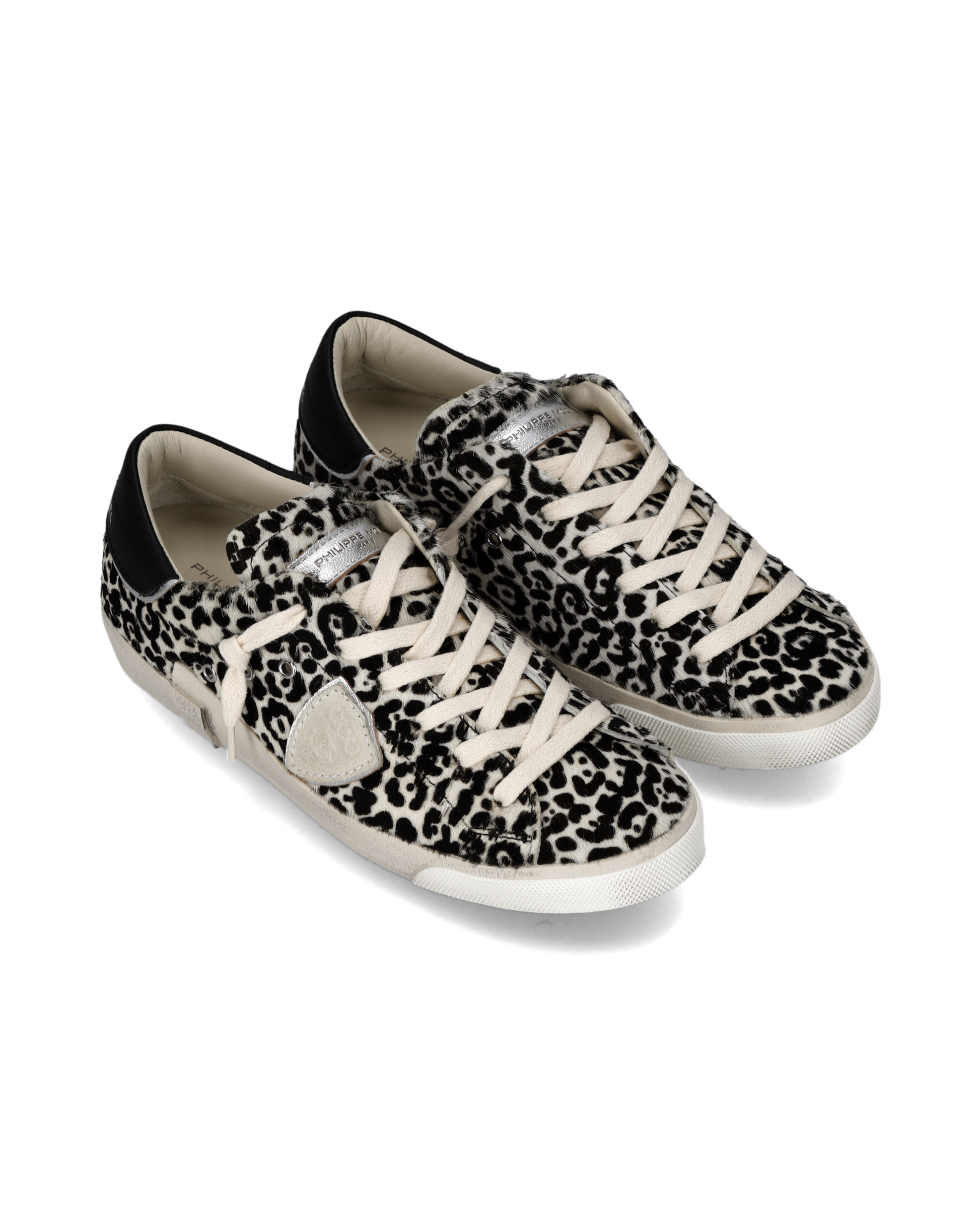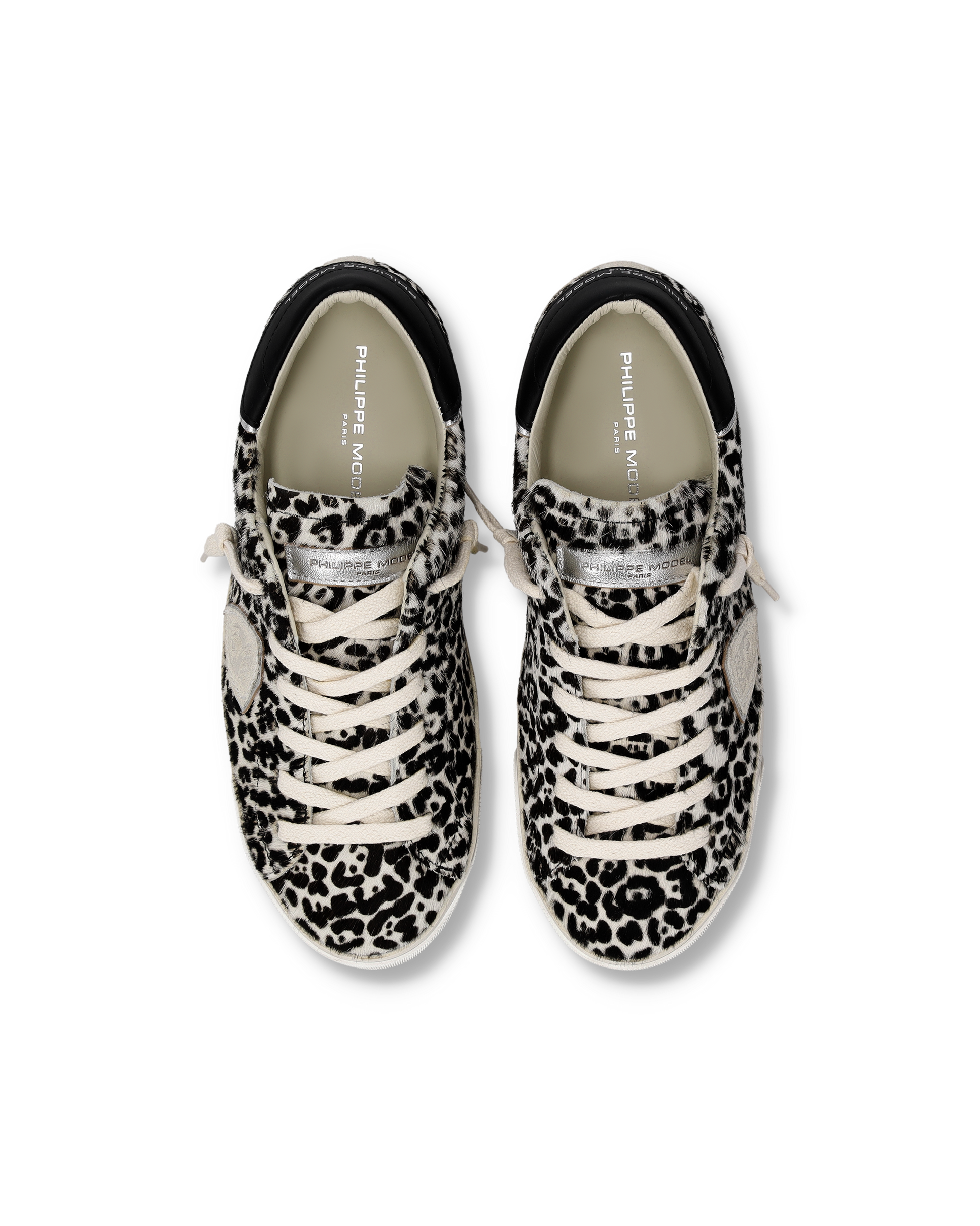 New details for an icon like Prsx, featuring a leopard-print upper in black and white cavallino, contrasted by a black heel tab and silver glitter laces. The beige shield provides a contrasting detail. The iconic sole with handcrafted milling and markings emphasises the worn effect of this low-top women's sneaker.