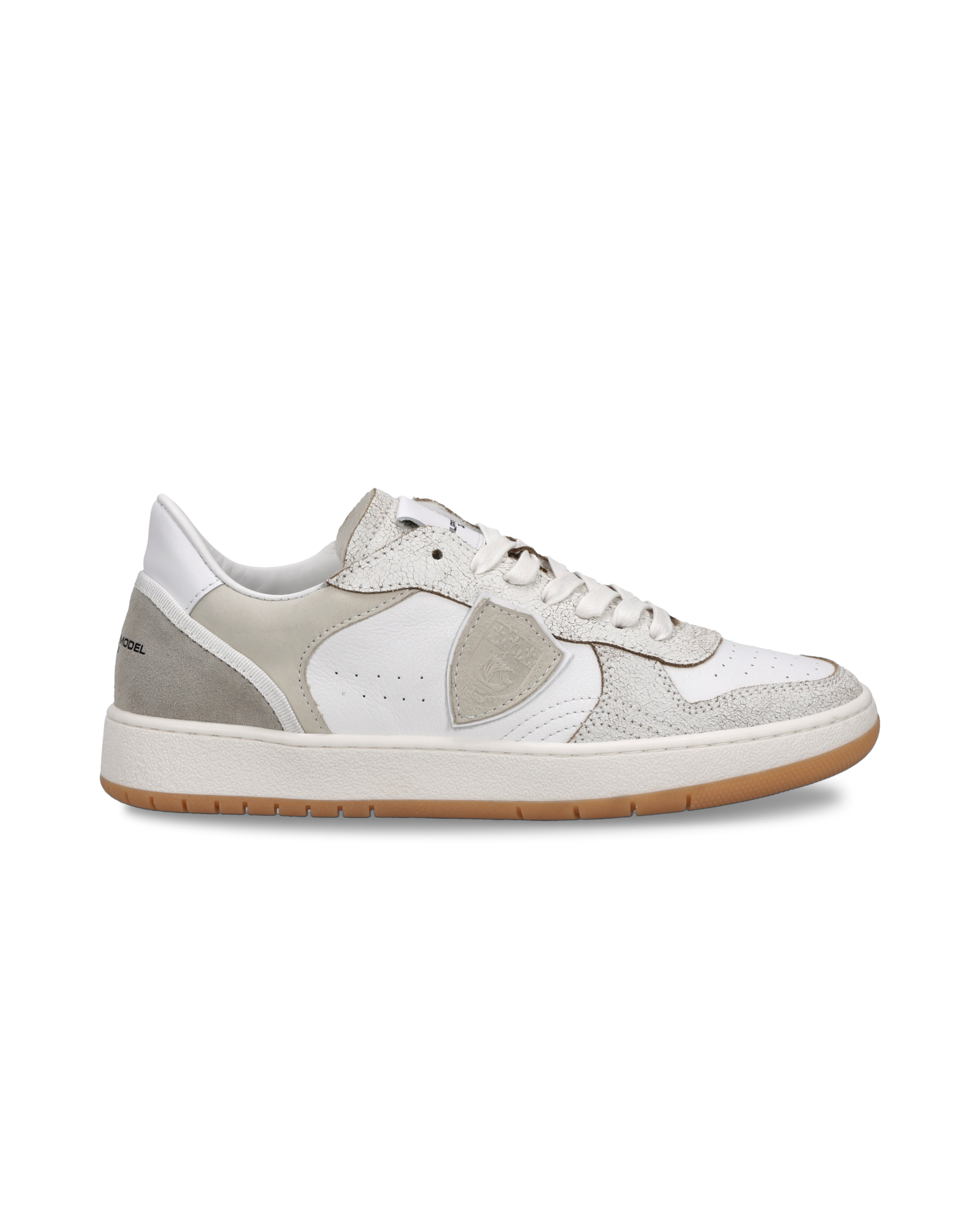 A true classic in this version in white and grey leather with an ultra-light rubber sole.
