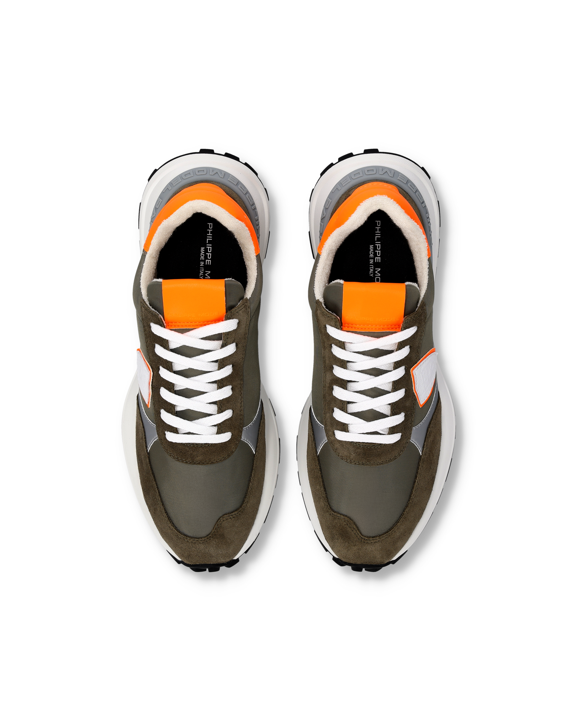 A creative encounter between the active world and metropolitan style, the Antibes sneaker offers a new sporty look for city wear. With its lines inspired by vintage models and upper in anthracite technical fabric and military green suede, it is the freshest expression of contemporary streetwear. The orange spoiler and piping add a distinctive touch. This sneaker is completed by a removable Ortholite insole and an ultra-light rubber sole with contrasting tread.