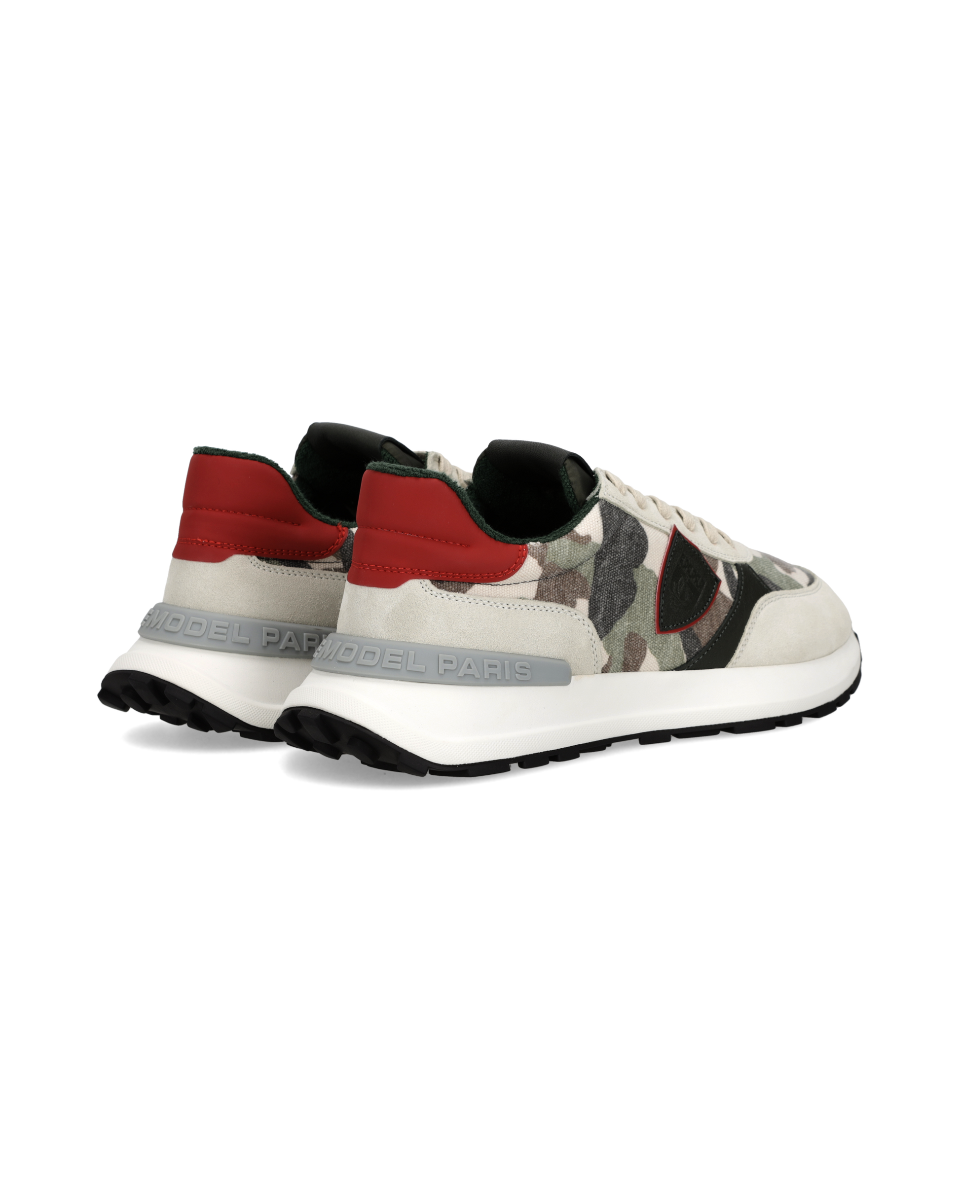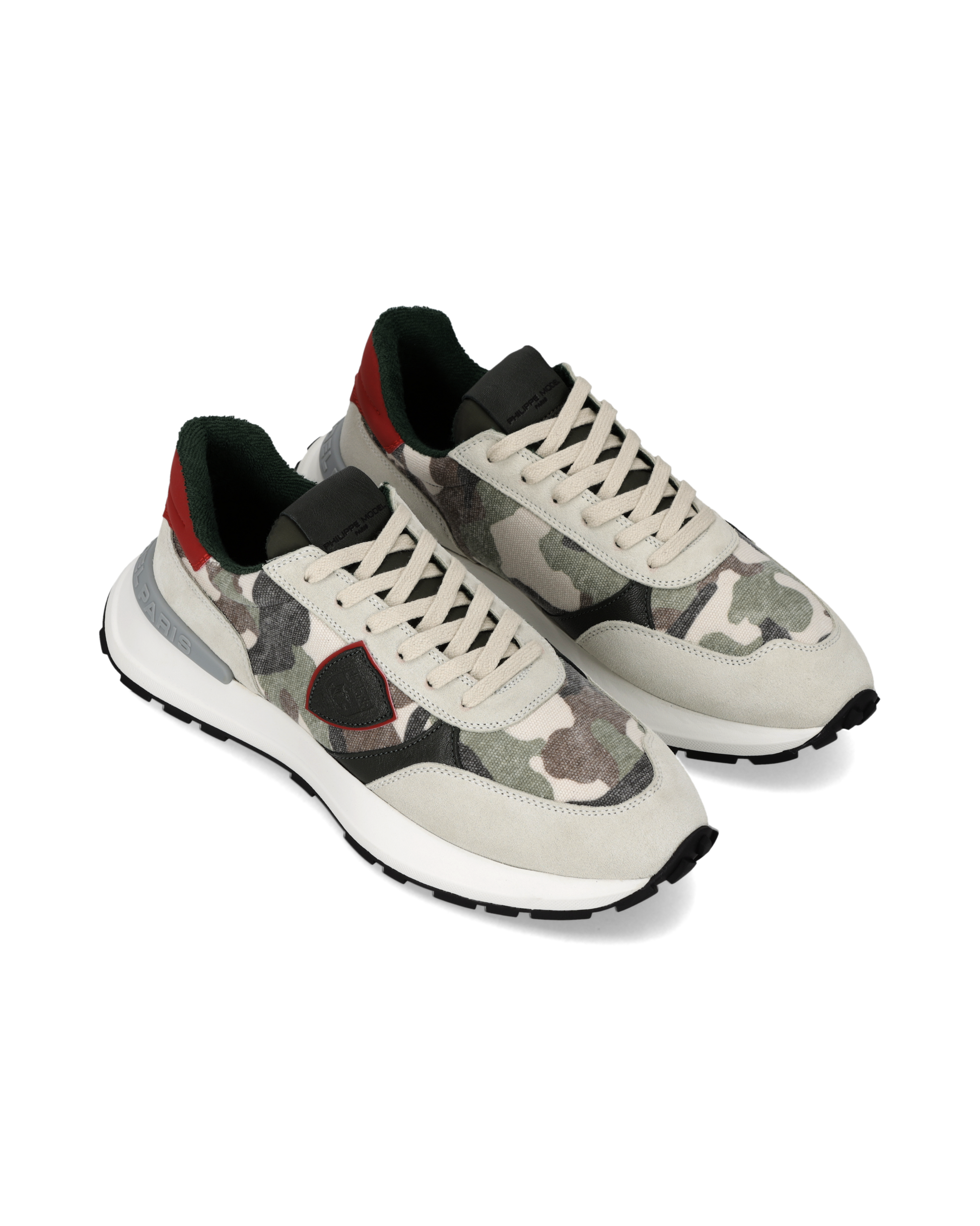 Dynamic attitude and metropolitan spirit: the Antibes trainers harmoniously blend sporty details with materials of all-Italian creativity. Like the light grey suede and mesh upper decorated with the new camouflage pattern. The red spoiler and black shield ignite the energy of a design inspired by vintage models, completed by an ultra-light rubber sole with matching tread.