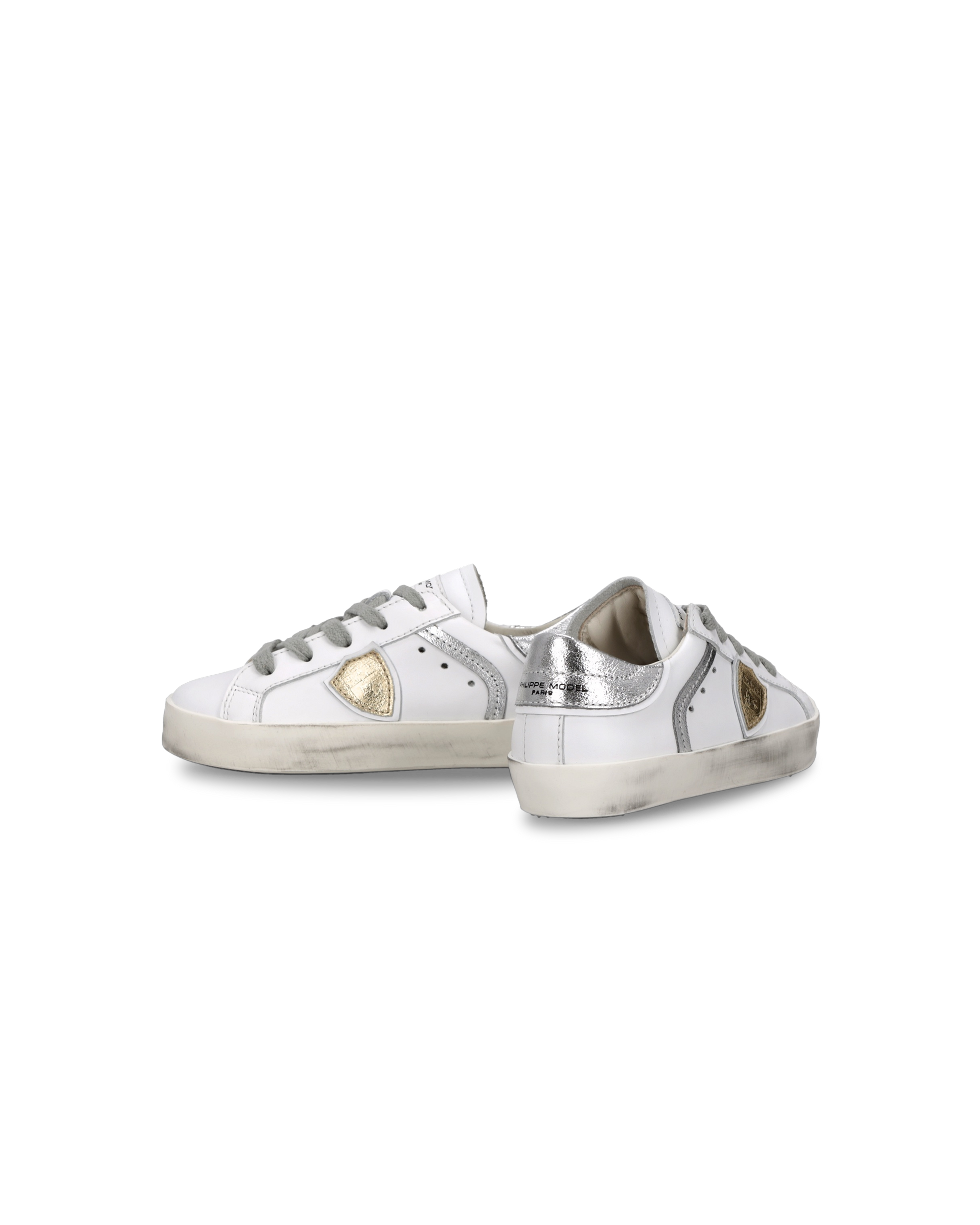 Silver and gold touches for the Baby version of the Prsx. The upper in white leather features a silver heel tab matching the side detail, silver laces and a gold shield. Inspired by street models, they are completed with a leather insole and cotton lining for ultimate comfort.