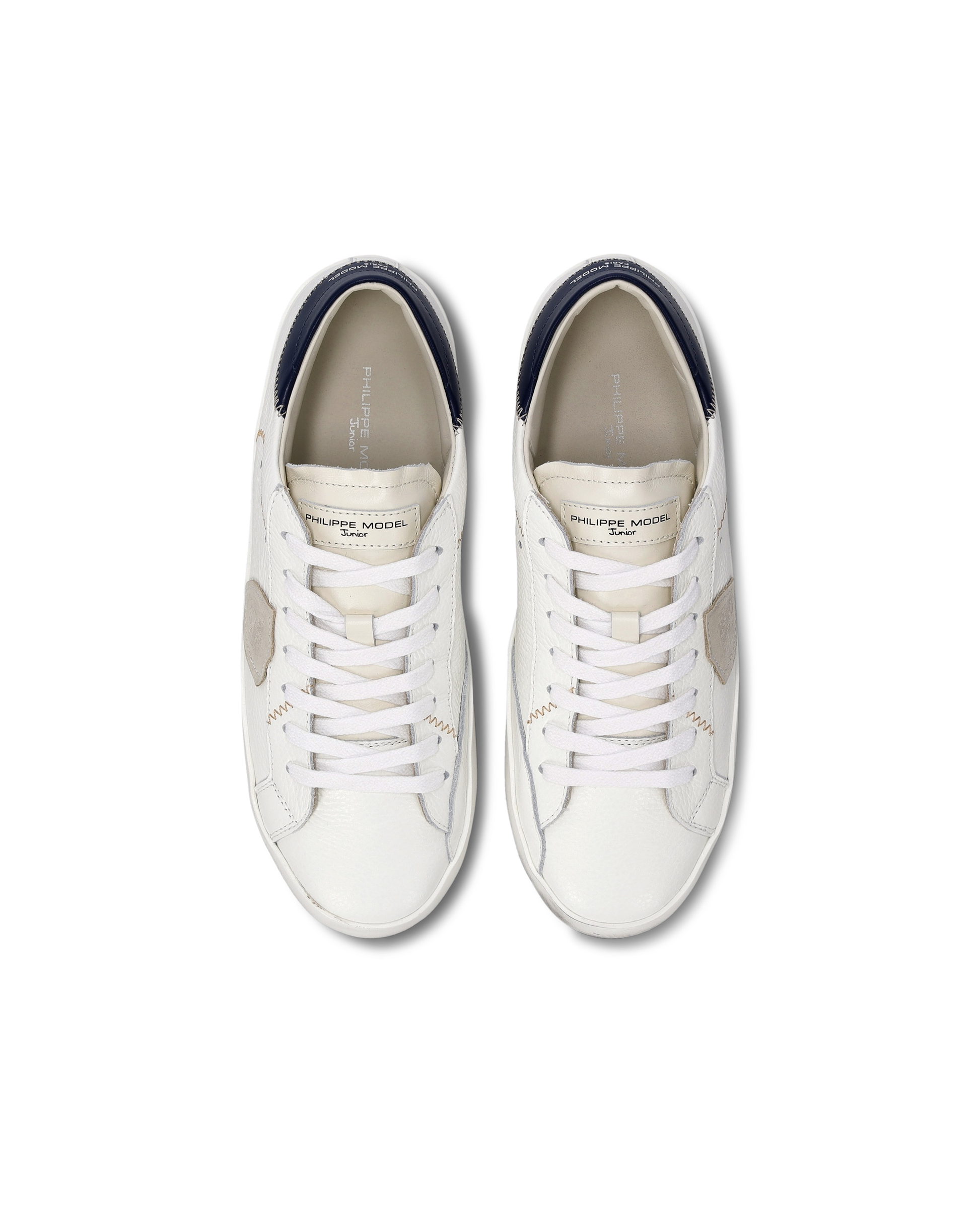 Cool details even in the smaller sizes: Prsx is evergreen and built to last. The construction retains its iconic design, with a brushed white leather upper and contrasting details, such as a beige shield, trims and visible stitching, and a blue heel tab.