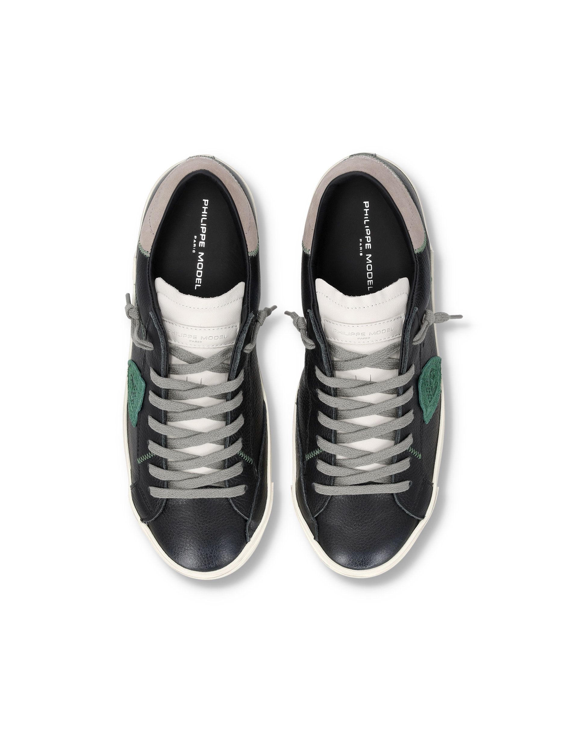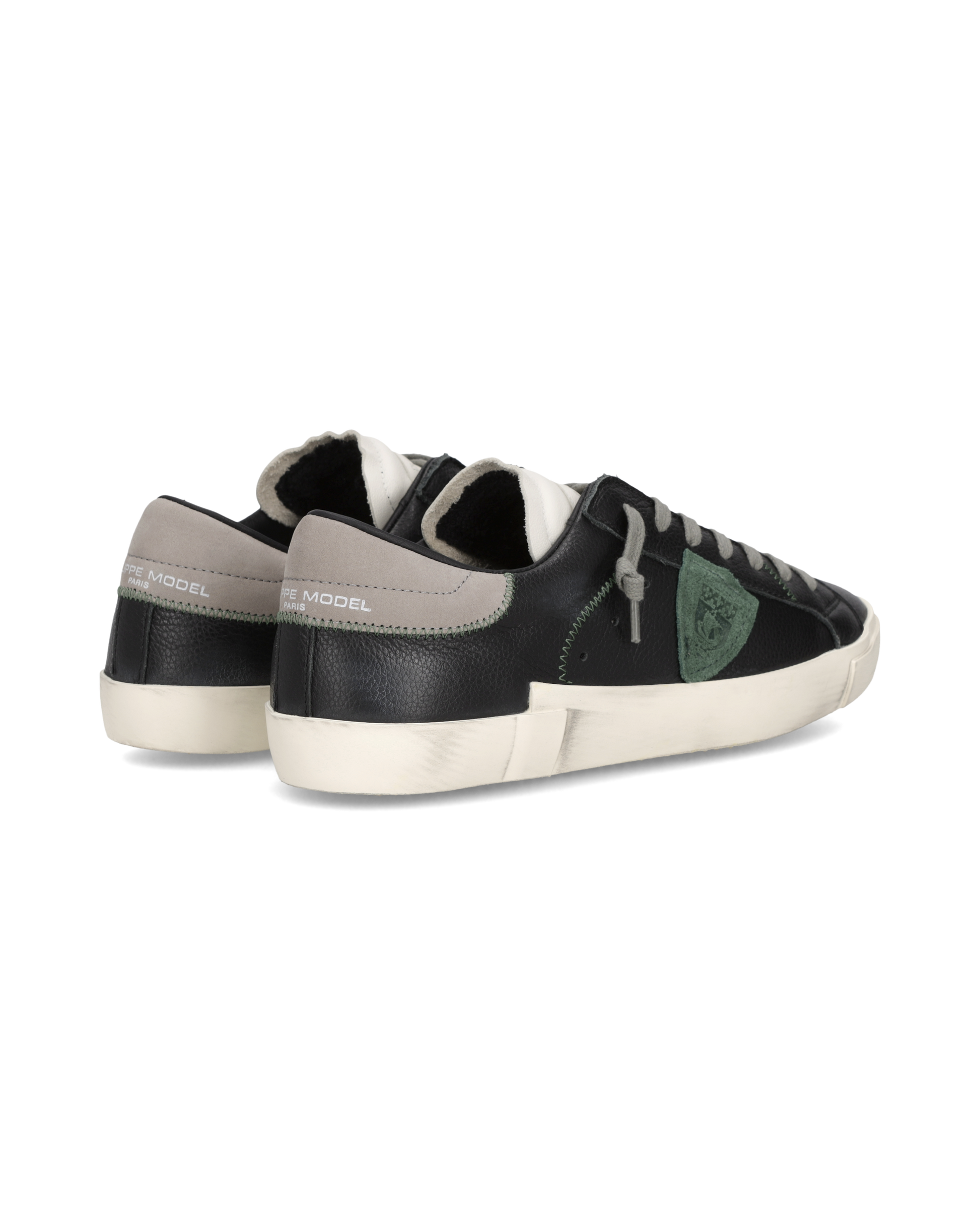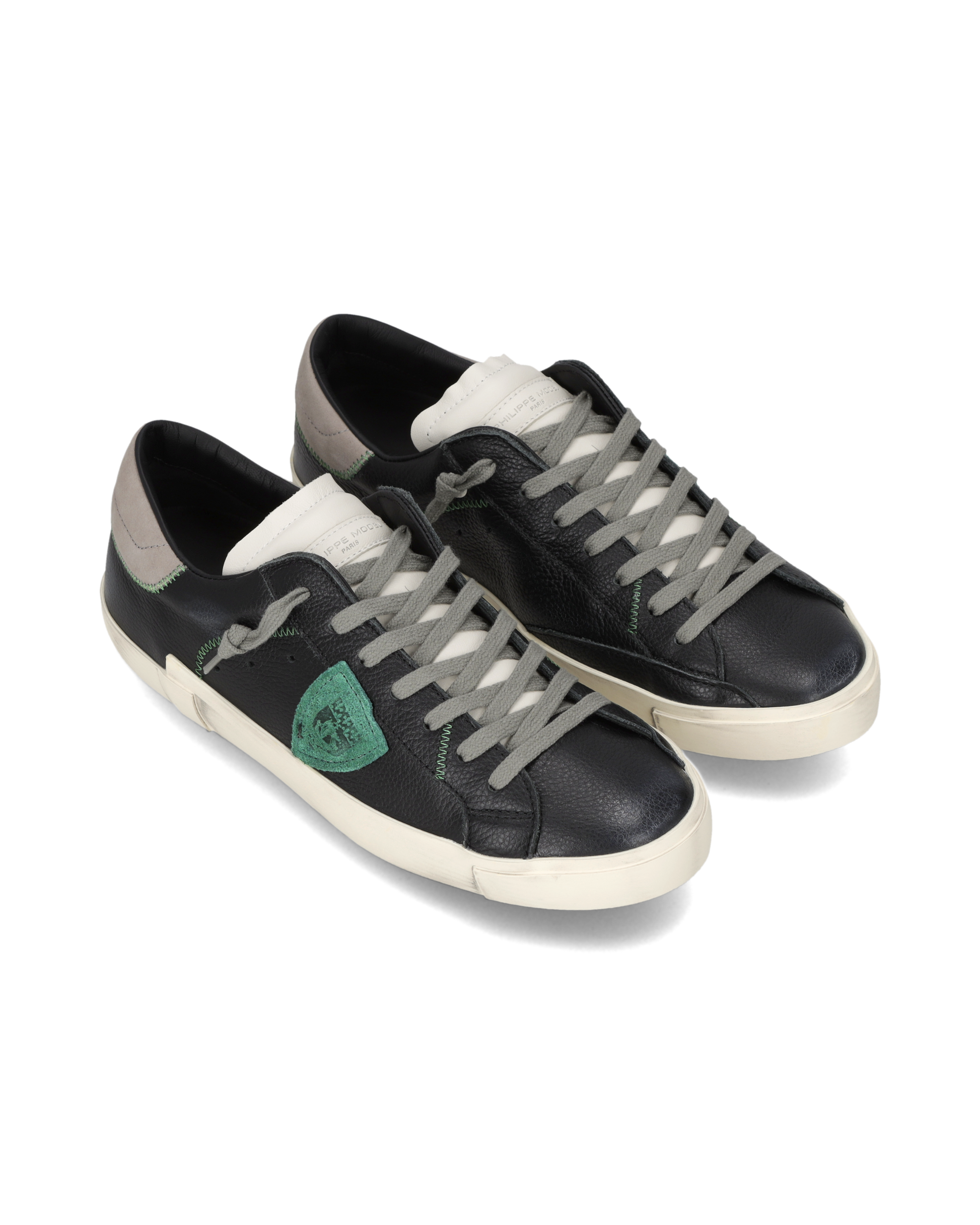 This Prsx sneaker stands out for its black leather upper treated to achieve a vintage effect. The green side shield adds an unexpected pop of colour, while the heel tab and grey laces create a refined contrast. The iconic sole with handcrafted milling and markings emphasises the worn effect of this low-top men's sneaker.