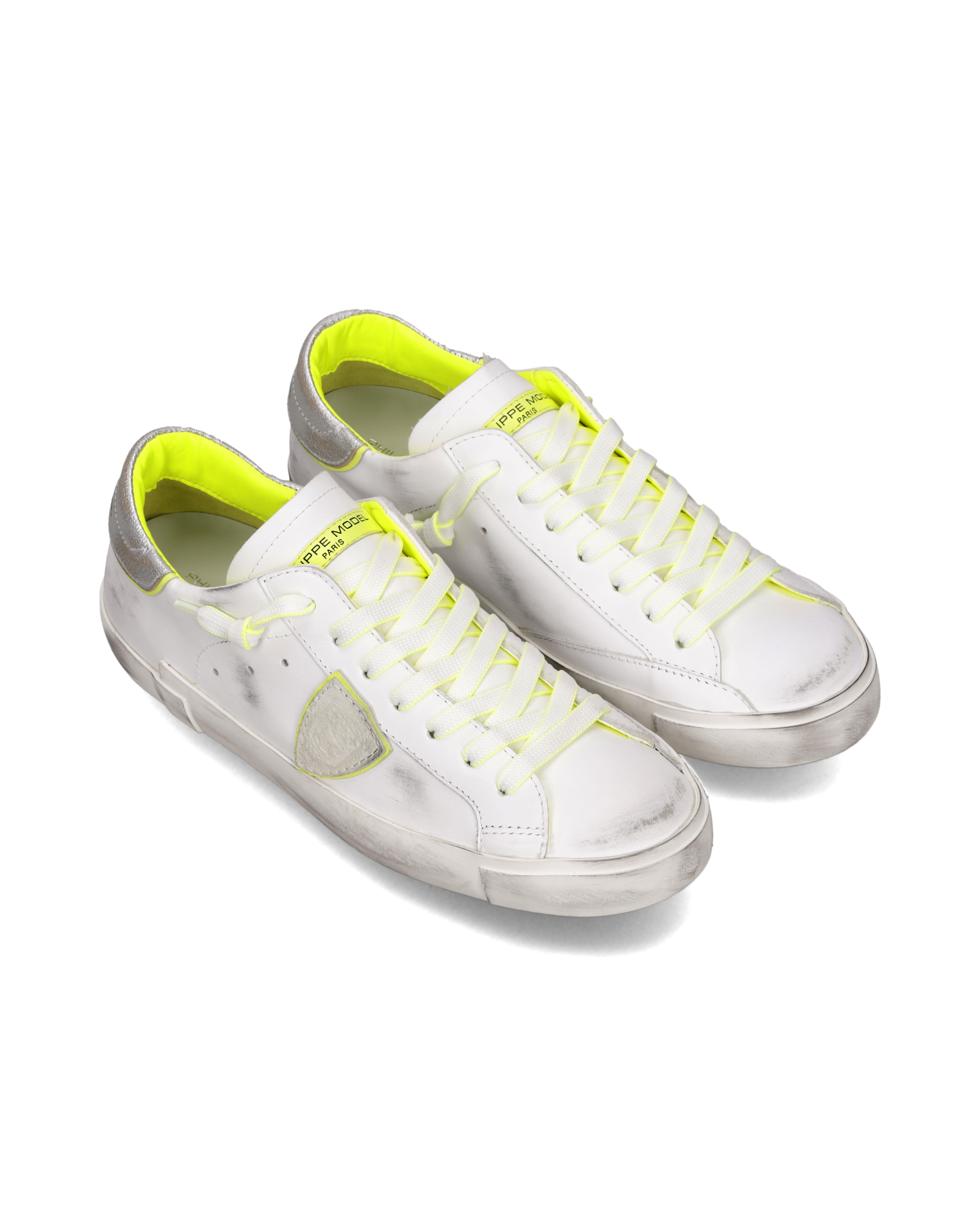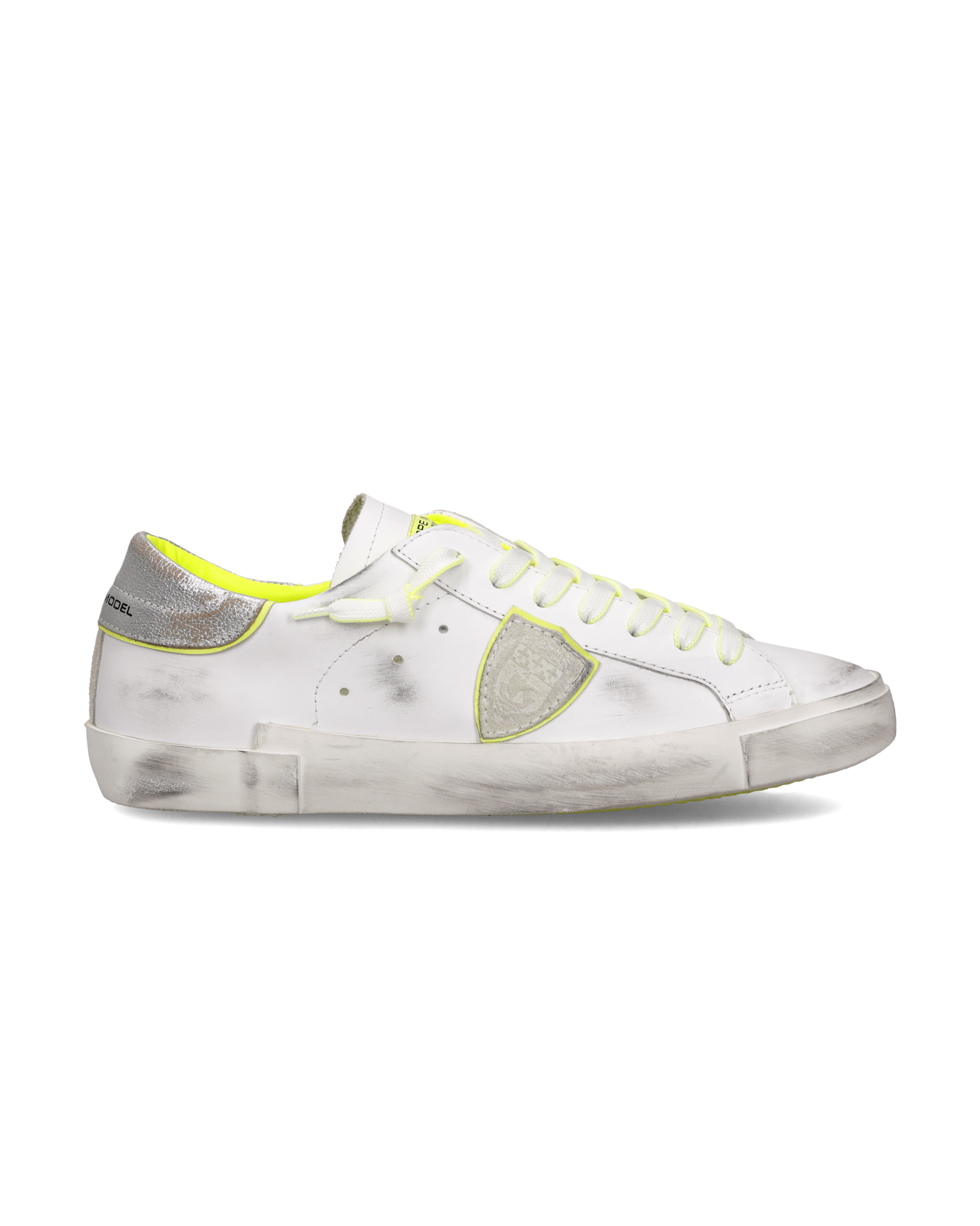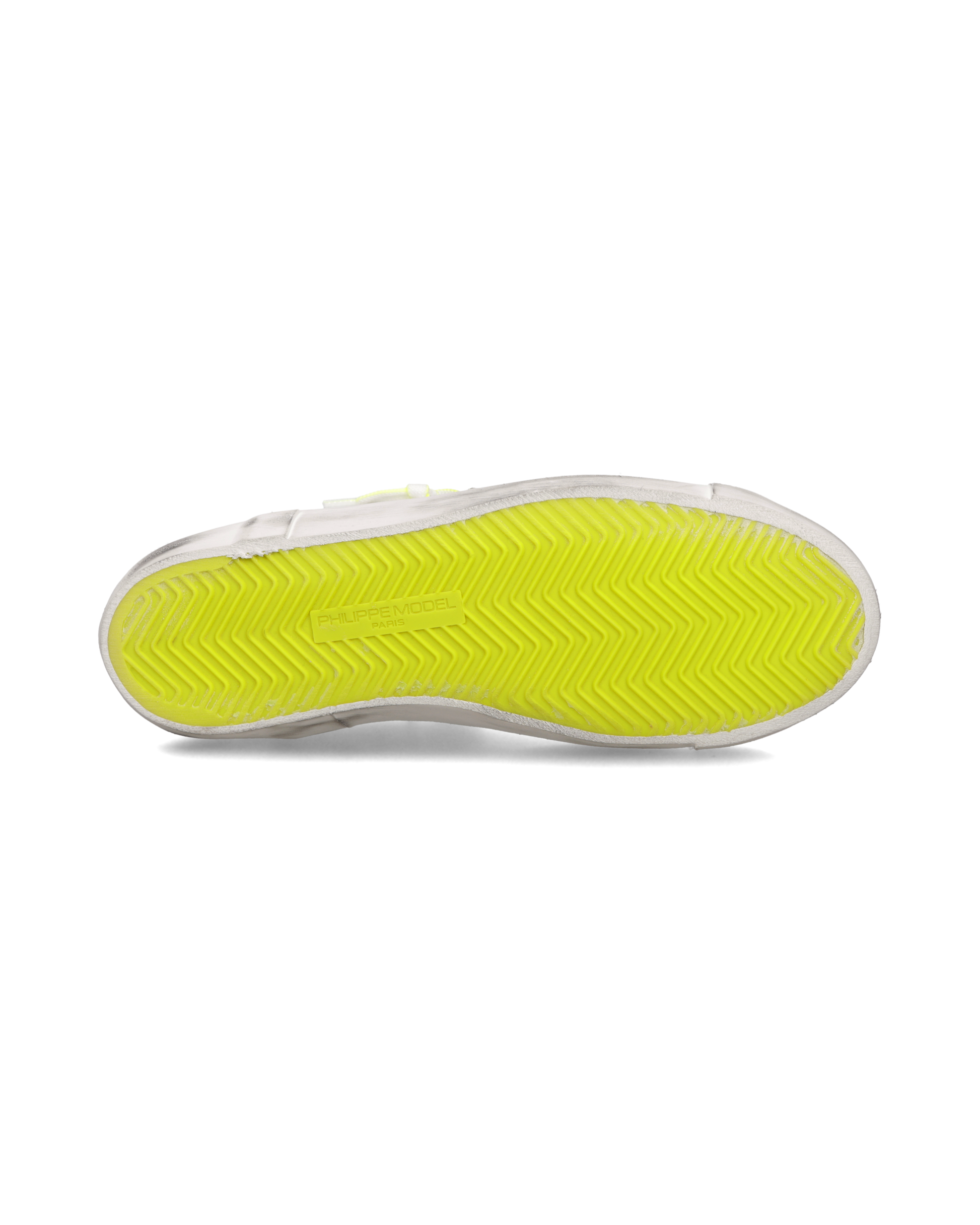 Essential for completing easy-chic looks in the city, the Prsx sneaker features a calfskin upper with an inner lining and neon yellow on the shield outline and laces. The heel tab remains silver, with a contrasting embossed suede shield for a pop touch. The result is simply eccentric – perfect for jeans or more classy outfits. The side band of the sole is handcrafted with markings for a worn effect echoing the upper.