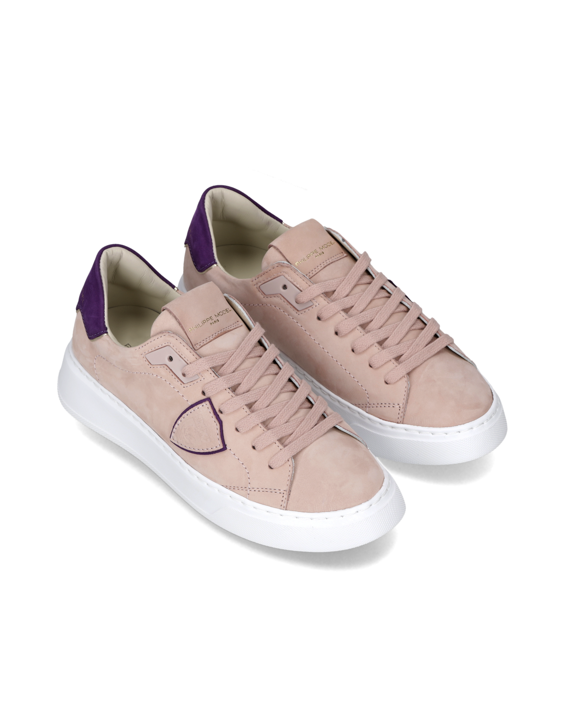 Design architettonico e spirito street. Temple è forme essenziali e semplicità ispirate ai modelli nineties e rivisitate con creatività. La tomaia in morbida pelle rosa è completata da spoiler viola abbinato al profilo dello scudo. La suola è in gomma ultra leggera.