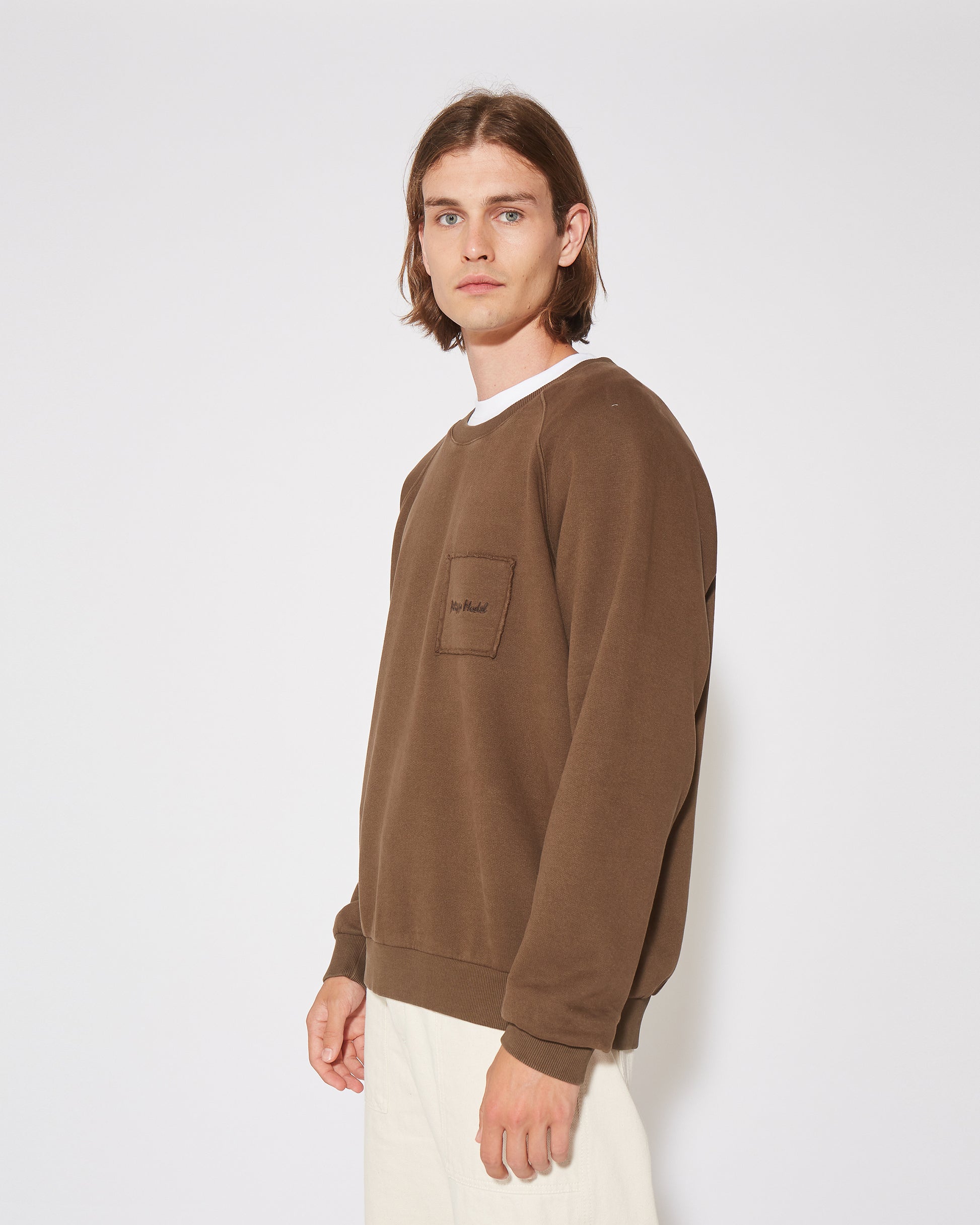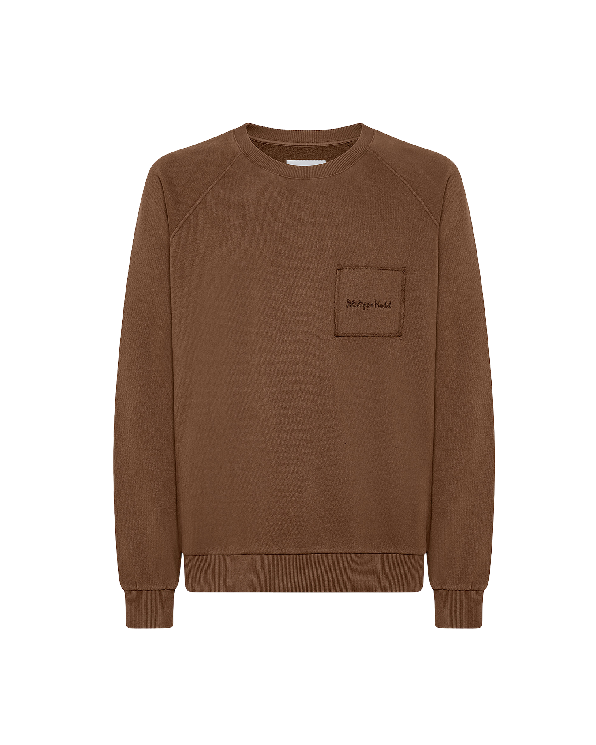 Stile francese contemporaneo e artigianalità italiana, la felpa Bernard ha un fit volutamente over ed è realizzata in cotone color noce. Girocollo, polsini e girovita sono in cotone a costine, mentre il logo, firma stilizzata del fondatore del marchio, è ricamato su patch effetto taglio a vivo e applicato a mano sul davanti. Le tasche a taglio vivo sono con interno foderato.