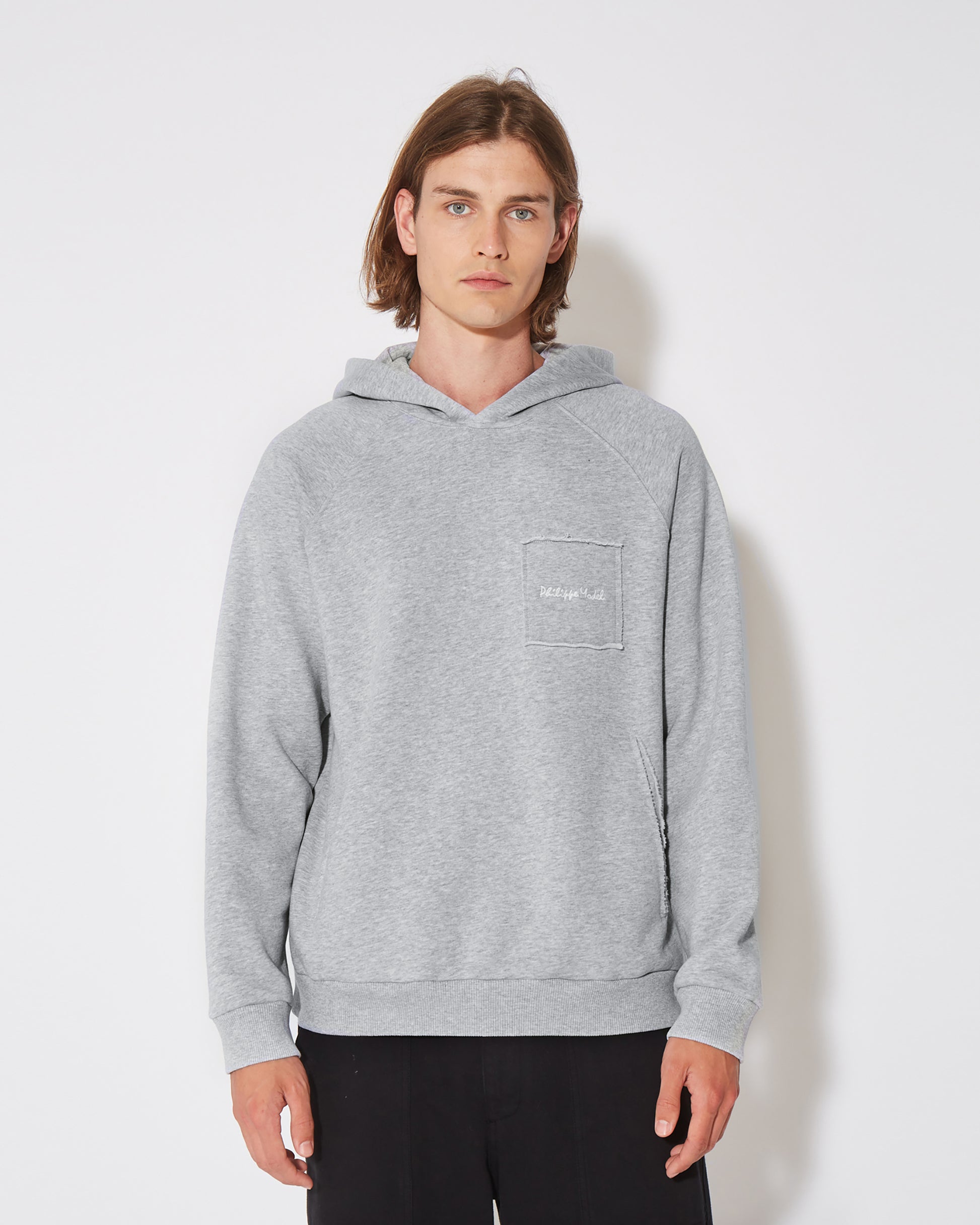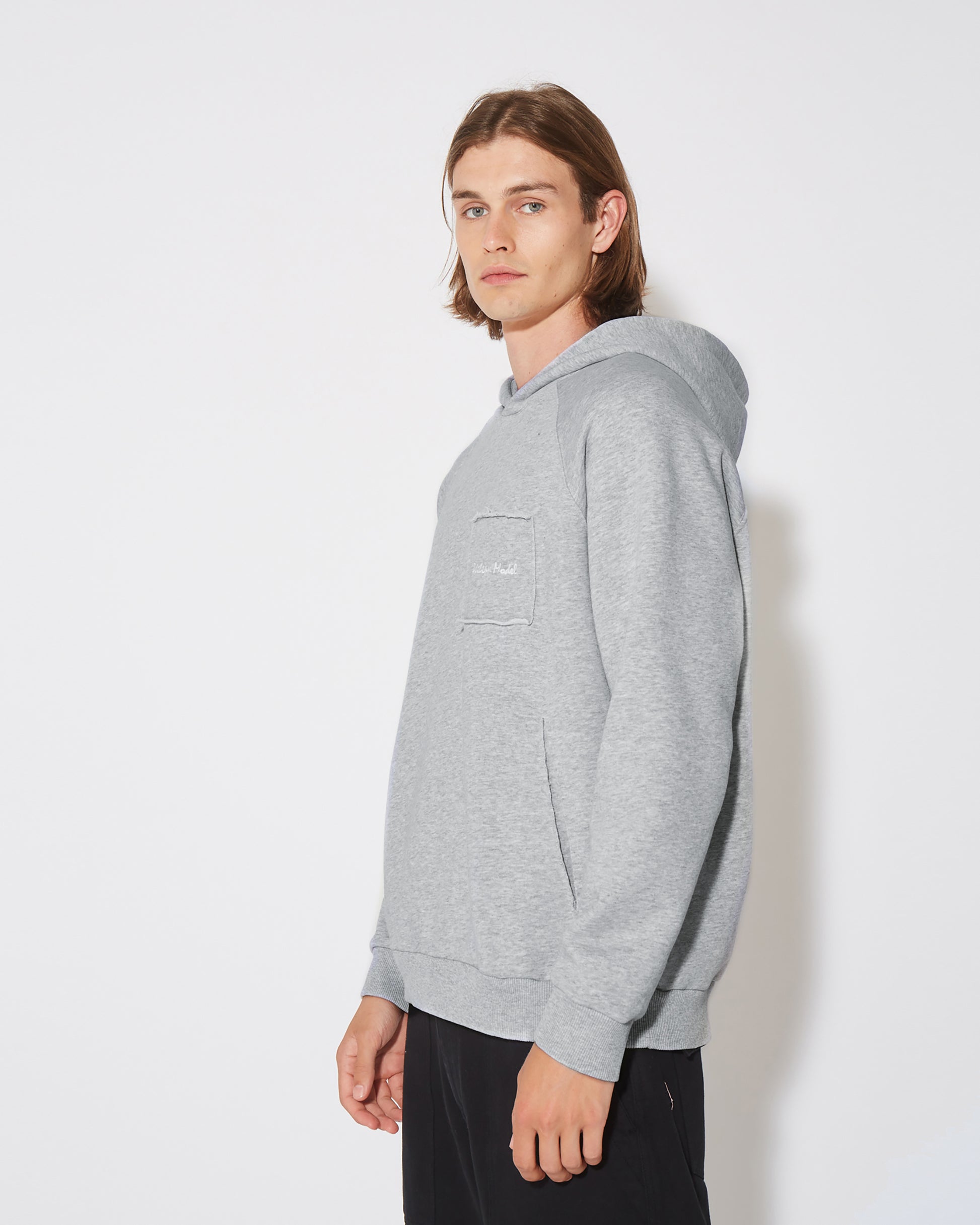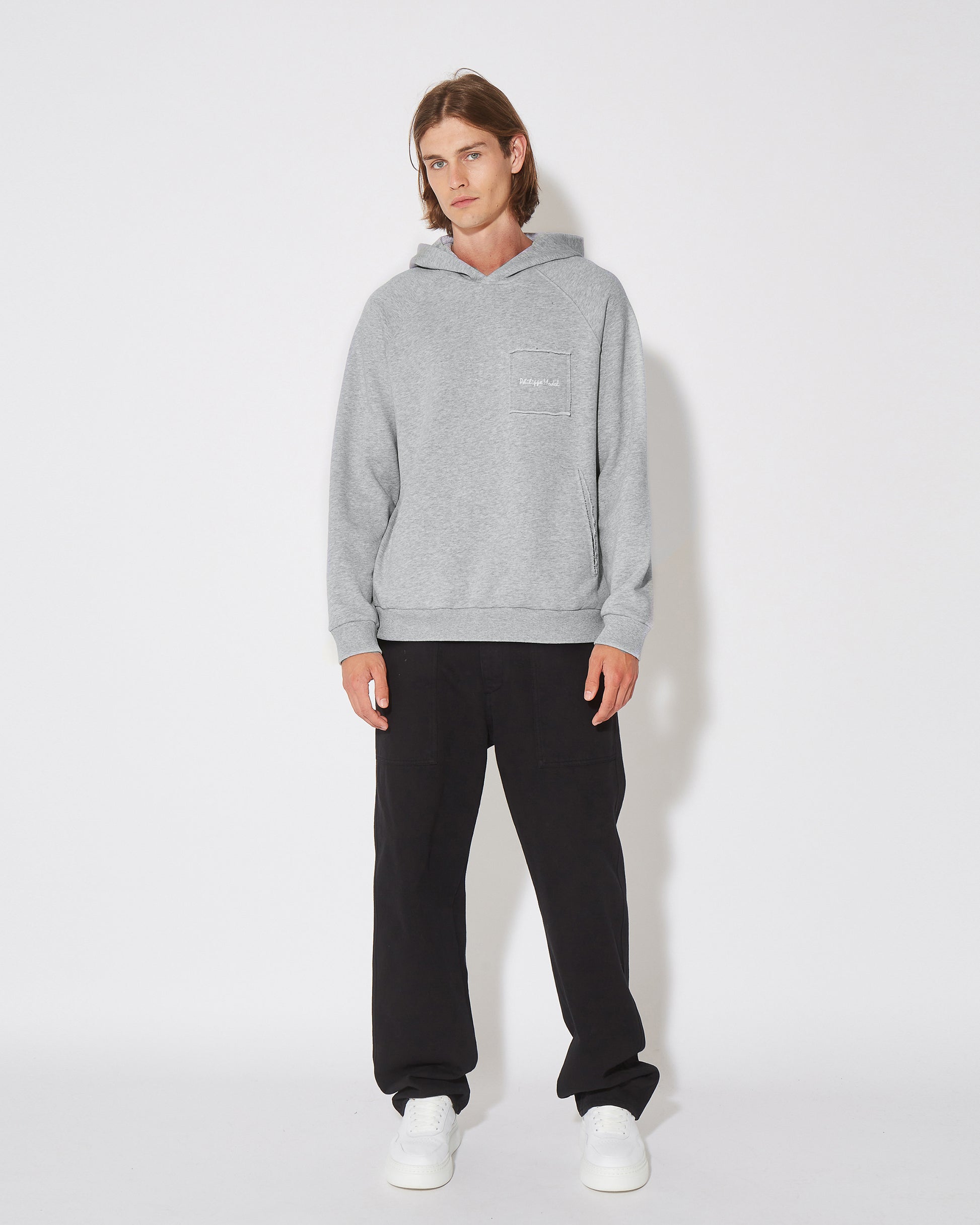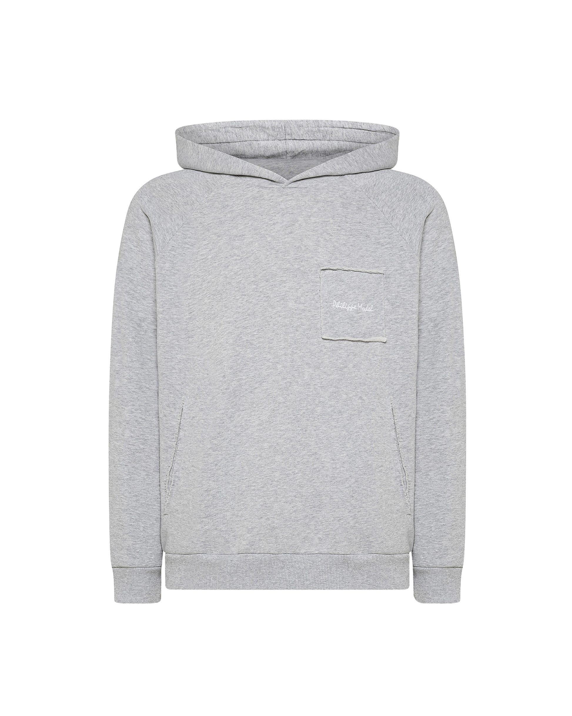 Stile francese contemporaneo e artigianalità italiana, la felpa hoodie Jean ha un fit volutamente over ed è realizzata in cotone color grigio melange. Il cappuccio è incrociato sul fronte e foderato intenamente, mentre polsini e girovita sono in cotone a costine e taglio della manica raglan. Il davanti è caratterizzato dal logo, firma stilizzata del fondatore del marchio, ricamato su patch applicato a mano e dalle tasche a taglio vivo con interno foderato.