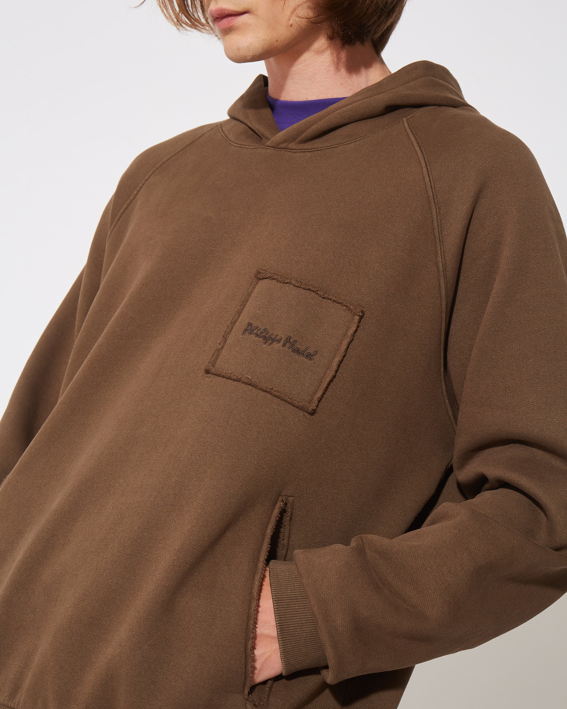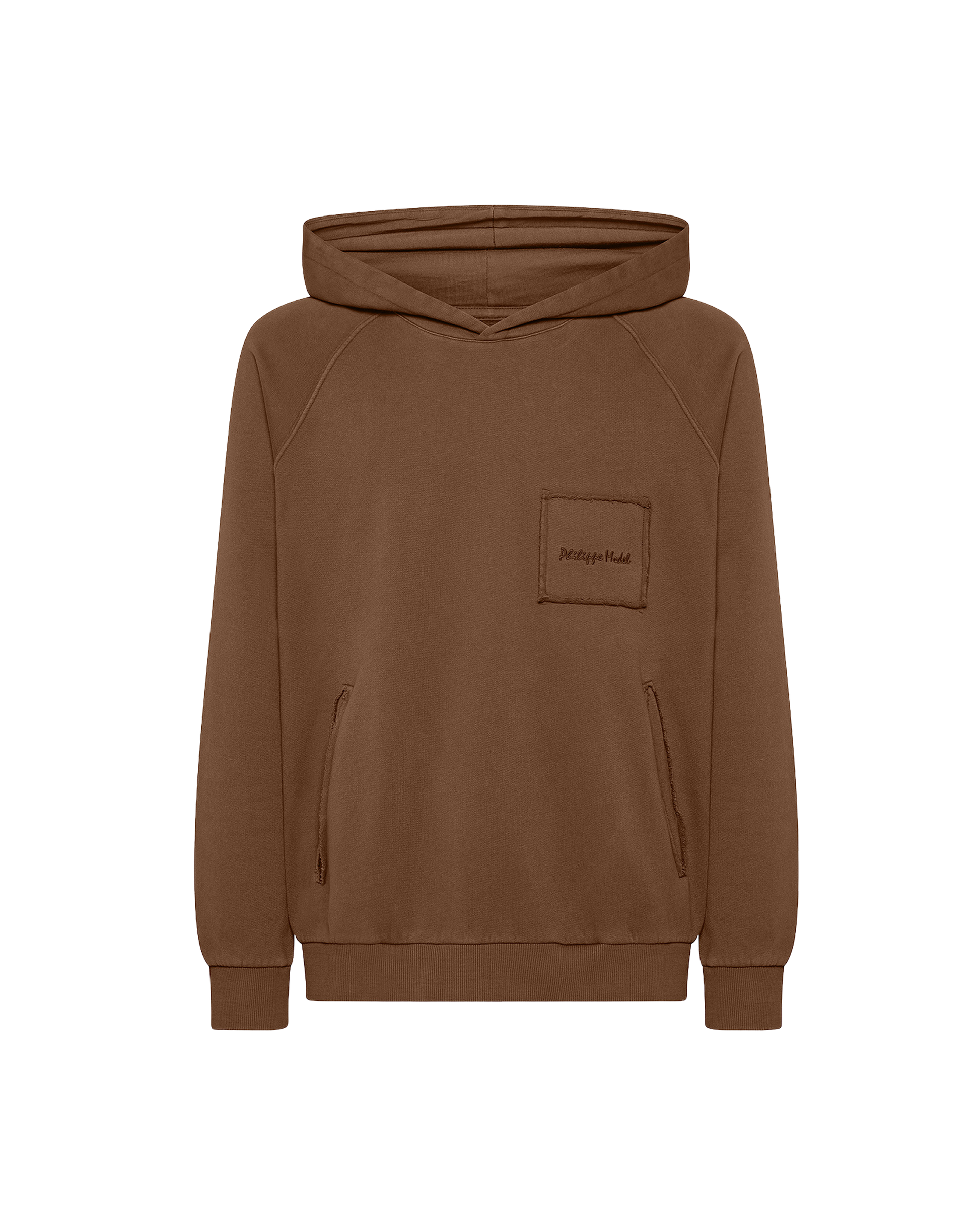 Stile francese contemporaneo e artigianalità italiana, la felpa hoodie Jean ha un fit volutamente over ed è realizzata in cotone color noce. Il cappuccio è incrociato sul fronte e foderato intenamente, mentre polsini e girovita sono in cotone a costine. Il davanti è caratterizzato dal logo, firma stilizzata del fondatore del marchio, ricamato su patch applicato a mano e dalle tasche a taglio vivo con interno foderato.